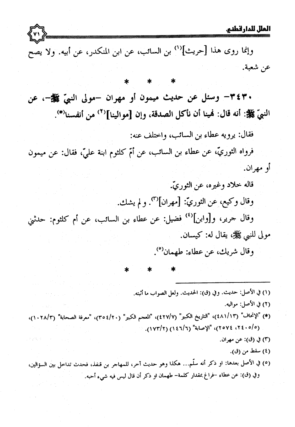 3430- وسئل عن حديث ميمون، أو مهران مَوْلَى النَّبِيِّ صَلَّى اللَّهُ عَلَيْهِ وَسَلَّمَ، عَنِ النَّبِيِّ صَلَّى اللَّهُ عَلَيْهِ وَسَلَّمَ أَنَّهُ قَالَ: نهينا أن نأكل الصدقة وإن موالينا من أنفسنا.