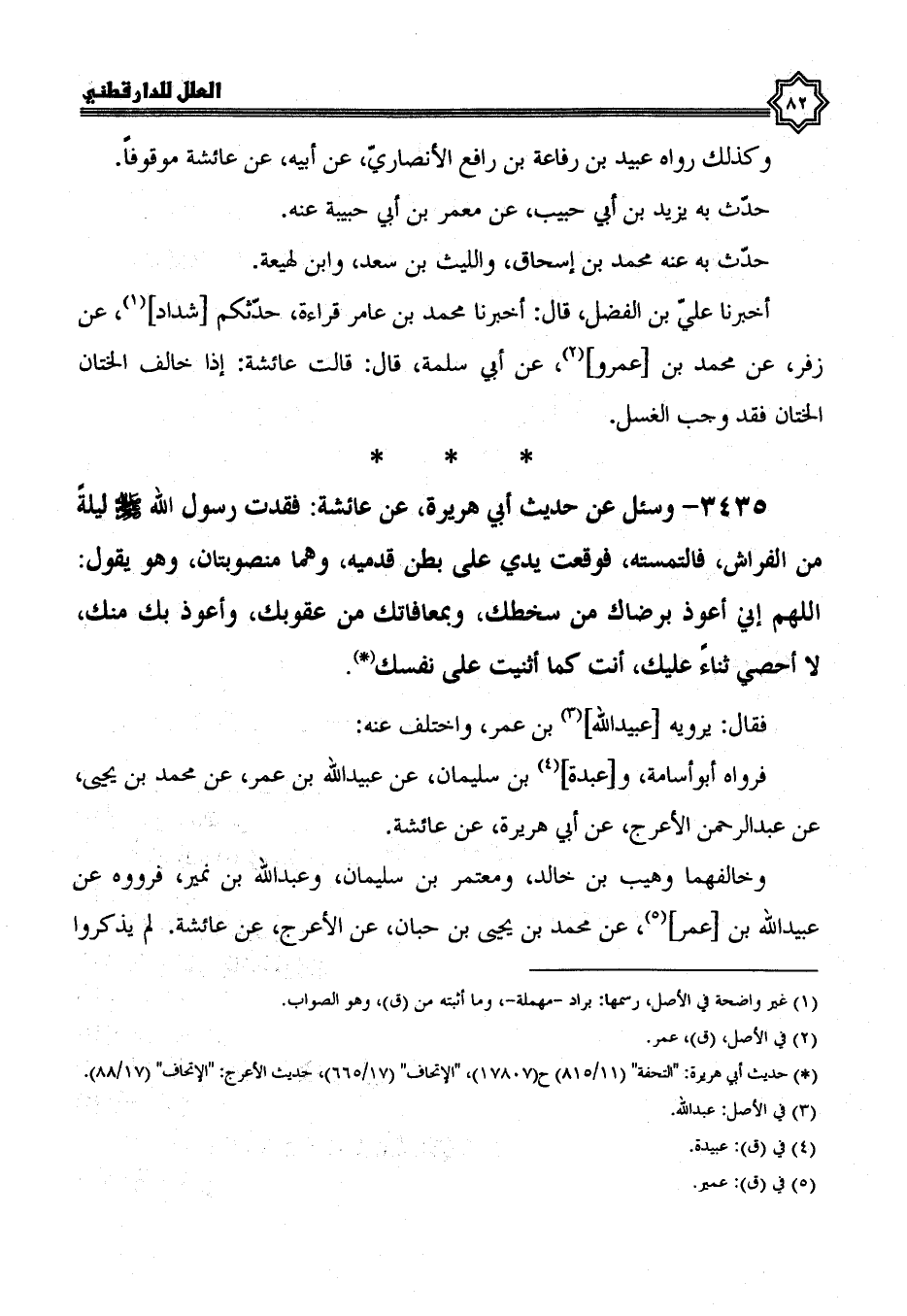 3435- وسئل عن حديث أبي هريرة، عن عائشة: فقدت رَسُولِ اللَّهِ صَلَّى اللَّهُ عَلَيْهِ وَسَلَّمَ لَيْلَةَ من الفراش فالتمسته فوقعت يدي على بطن قدميه وهما منصوبتان وهو يقول: اللهم إني أعوذ برضاك من سخطك، وبمعافاتك من عقوبتك (1) ، وأعوذ بك منك لا أحصي ثناء عليك أنت كما أثنيت على نفسك.