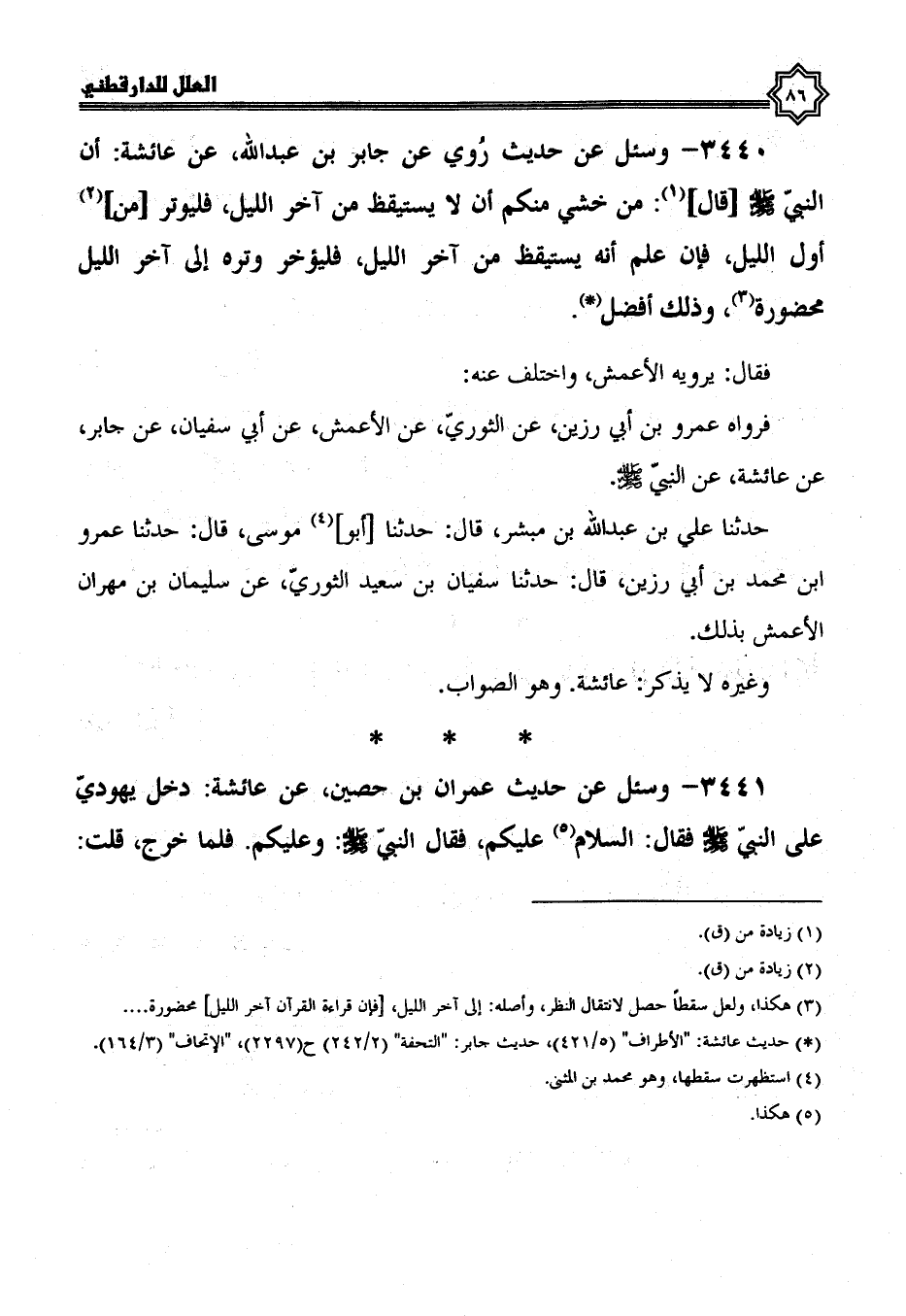 3440- وسئل عن حديث روي عن جابر بن عبد الله، عن عائشة، أن النبي صلى الله عليه وسلم قال: من خشي منكم أن لا يستيقظ من آخر الليل فليوتر من أول الليل، فإن علم أنه يستيقظ من آخر الليل فليؤخر وتره إلى آخر الليل، محضورة وذلك أفضل.