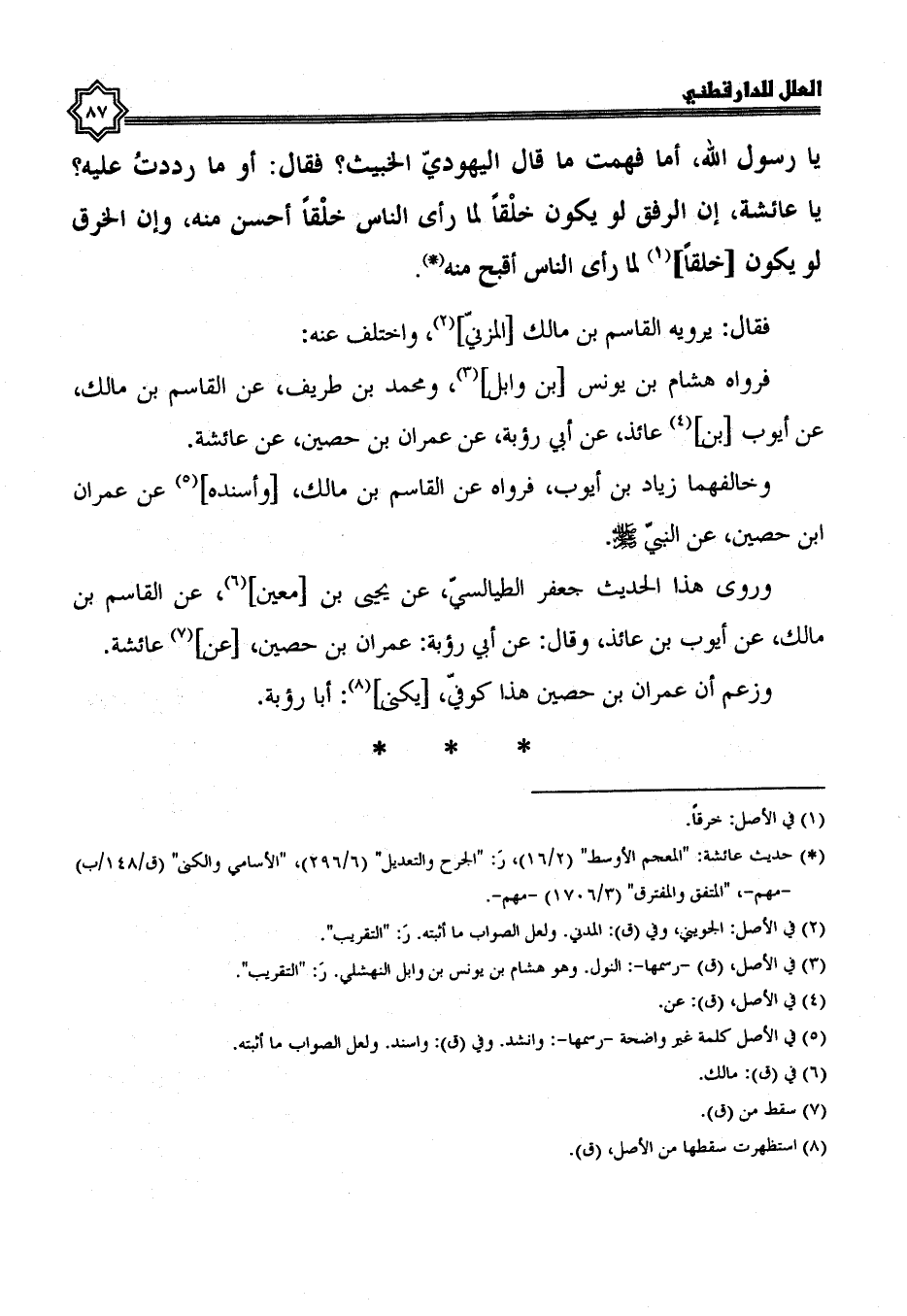 فقال: يرويه القاسم بن مالك المزني، واختلف عنه فرواه هشام بن يونس بن وابل ومحمد بن طريف، عن القاسم بن مالك، عن أيوب بن عائذ، عن أبي رؤبة، عن عمران بن حصين، عن عائشة وخالفهما زياد بن أيوب فرواه عن القاسم بن مالك، وأسنده عَنْ عِمْرَانَ بْنِ حُصَيْنٍ، عَنِ النَّبِيِّ صَلَّى الله عليه وسلم.