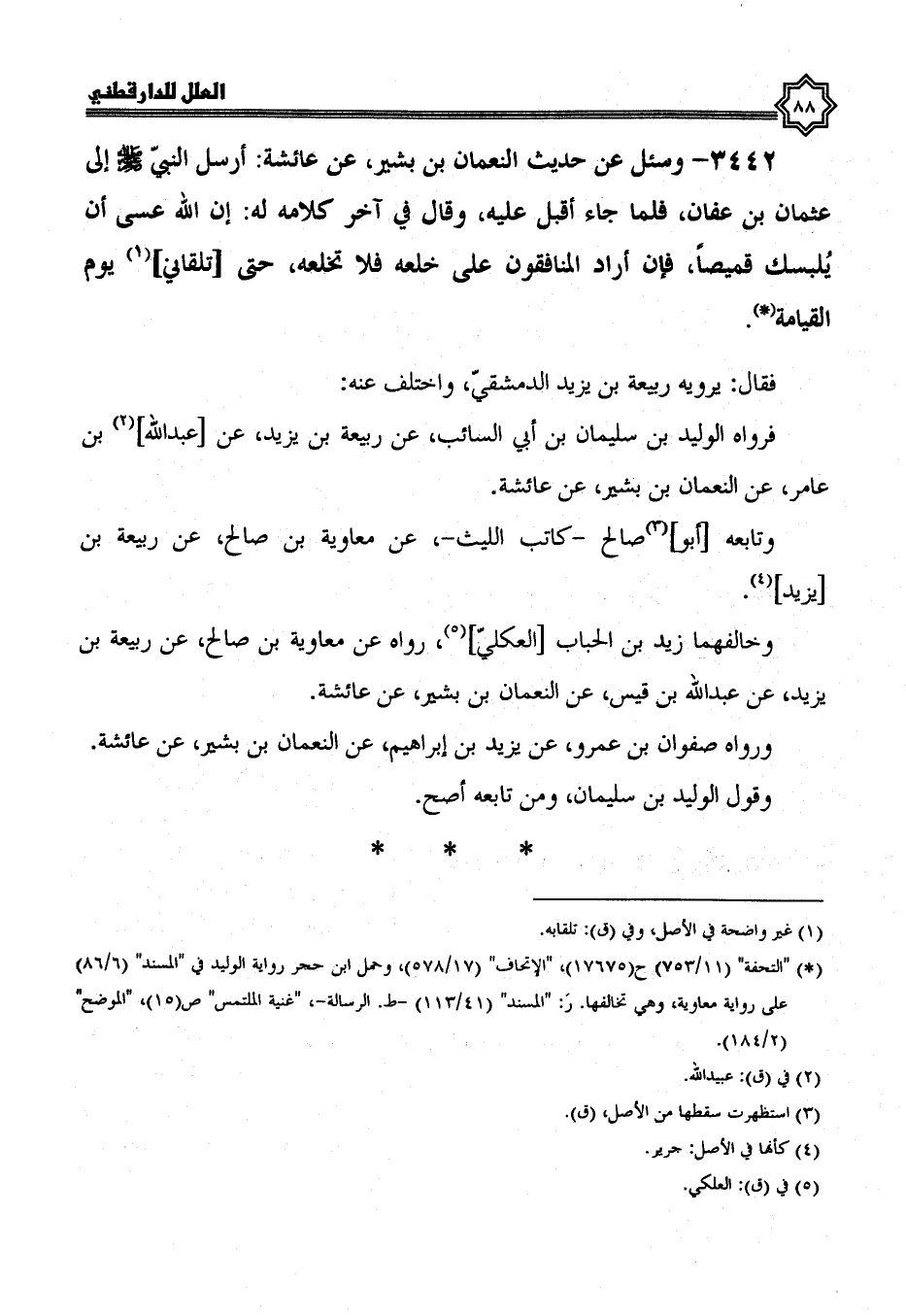 3442- وَسُئِلَ عَنْ حَدِيثِ النُّعْمَانِ بْنِ بَشِيرٍ، عَنْ عائشة أرسل النبي صلى الله عليه وسلم إلى عثمان بن عفان، فلما جاء أقبل عليه، وقال في آخر كلامه له إن الله عسى أن يلبسك قميصا فإن أراد المنافقون على خلعه فلا تخلعه حتى تلقاني يوم القيامة.