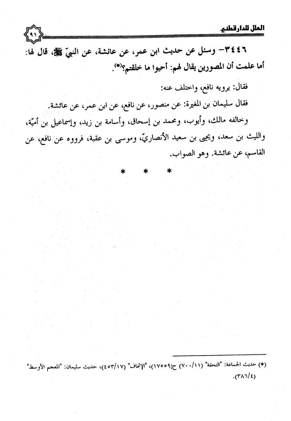 3446- وسئل عن حديث ابْنِ عُمَرَ، عَنْ عَائِشَةَ، عَنِ النَّبِيِّ صَلَّى اللَّهُ عَلَيْهِ وسلم، قال لها: أما علمت أن المصورين يقال لهم: أحيوا ما خلقتم.