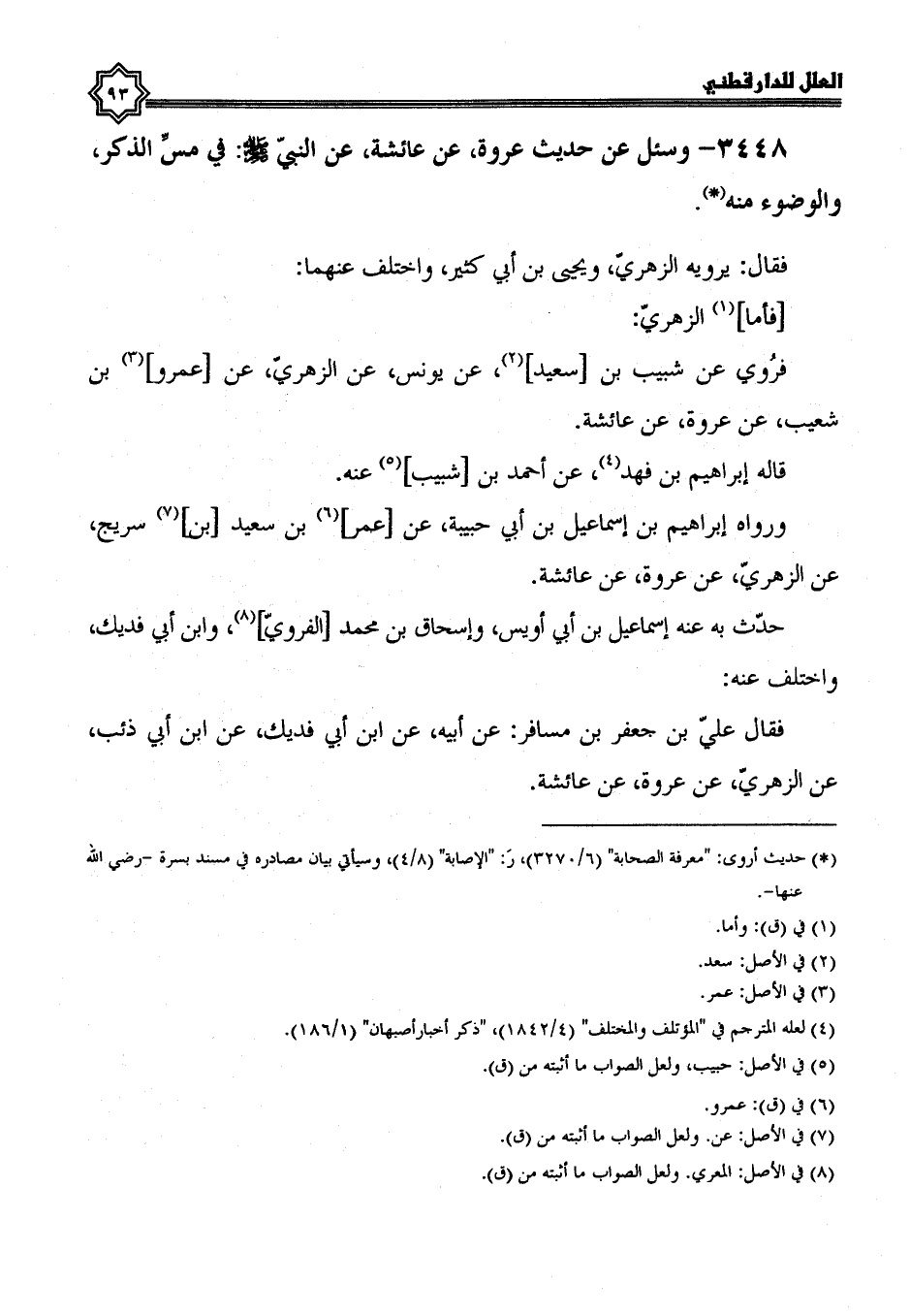 3448- وَسُئِلَ عَنْ حَدِيثِ عُرْوَةَ، عَنْ عَائِشَةَ، عَنْ النَّبِيِّ صَلَّى اللَّهُ عَلَيْهِ وسلم؛ في مس الذكر والوضوء منه.