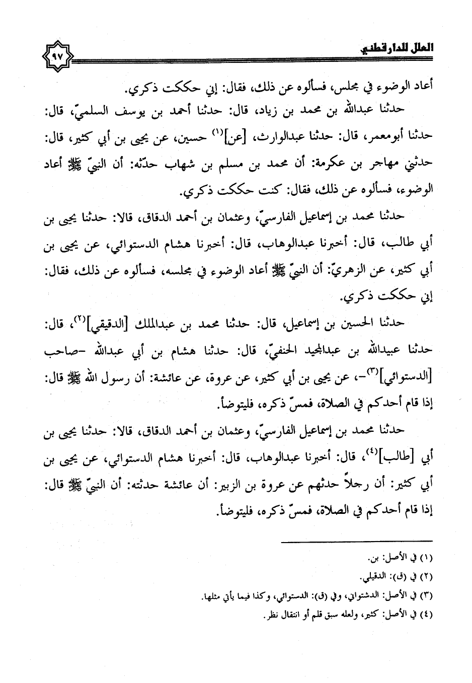 حدثنا محمد بن إسماعيل الفارسي، وعثمان بن أحمد الدقاق، قالا: حدثنا يحيى بن أبي طالب، قال: أخبرنا عبد الوهاب، قال: أخبرنا هِشَامٍ الدَّسْتُوَائِيِّ، عَنْ يَحْيَى بْنِ أَبِي كَثِيرٍ، عَنِ الزُّهْرِيِّ، أَنَّ النَّبِيَّ صَلَّى اللَّهُ عَلَيْهِ وسلم أعاد الوضوء في مجلسه، فسألوه عن ذلك فقال: إني حككت ذكري.