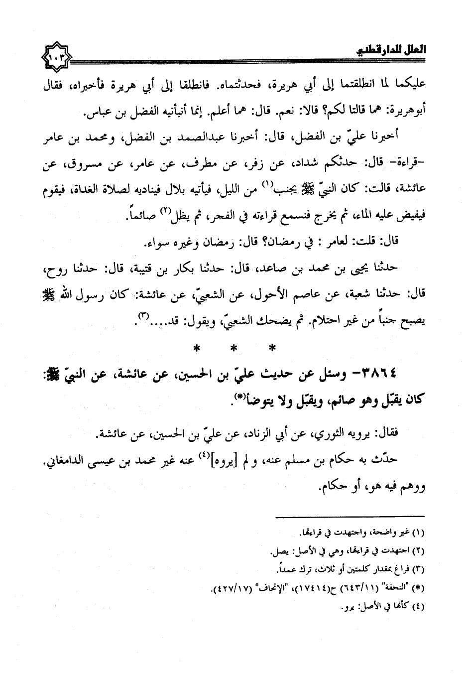 3864- وَسُئِلَ عَنْ حَدِيثِ عَلِيِّ بْنِ الْحُسَيْنِ، عَنْ عَائِشَةَ، عَنِ النَّبِيِّ صَلَّى اللَّهُ عَلَيْهِ وَسَلَّمَ كان يقبل وهو صائم، ويقبل ولا يتوضأ.