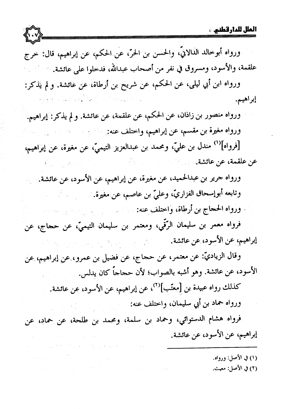 فَرَوَاهُ معمر بن سليمان الرقي، ومعتمر بن سليمان التيمي، عن حجاج، عن إبراهيم، عن الأسود، عن عائشة وقال الزيادي: عن معتمر، عَنْ حَجَّاجٍ، عَنْ فُضَيْلِ بْنِ عَمْرٍو، عَنْ إبراهيم، عن الأسود، عن عائشة، وهو أشبه بالصواب، لأن حجاجا كان يدلس كذلك رواه عبيدة بن معتب، عَنْ إِبْرَاهِيمَ، عَنِ الْأَسْوَدِ، عَنْ عَائِشَةَ.