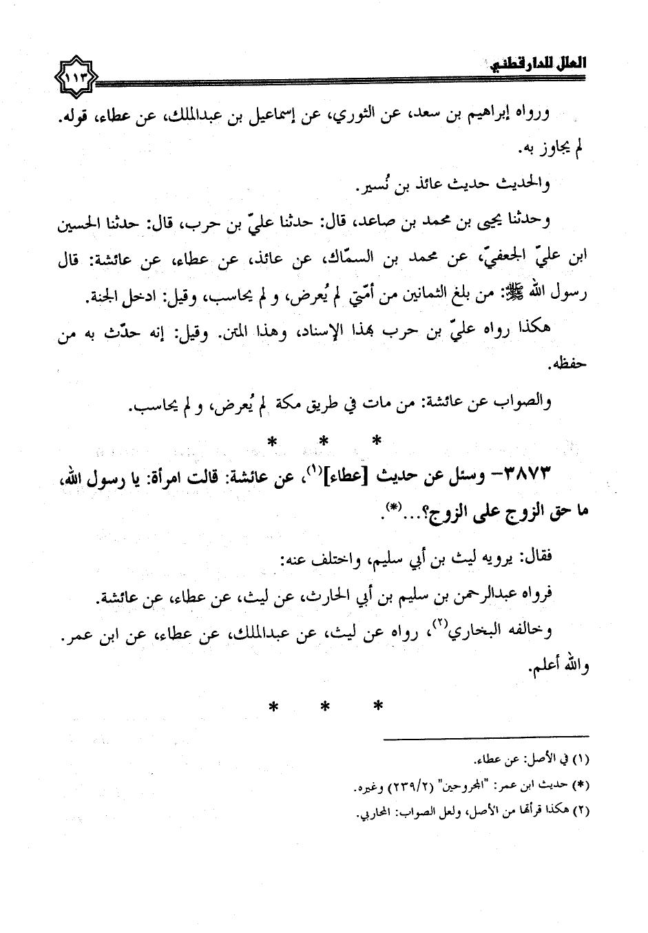 3873- وسئل عن حديث عطاء، عن عائشة قالت امرأة: يا رسول الله ما حق الزوج على الزوج؟ ...