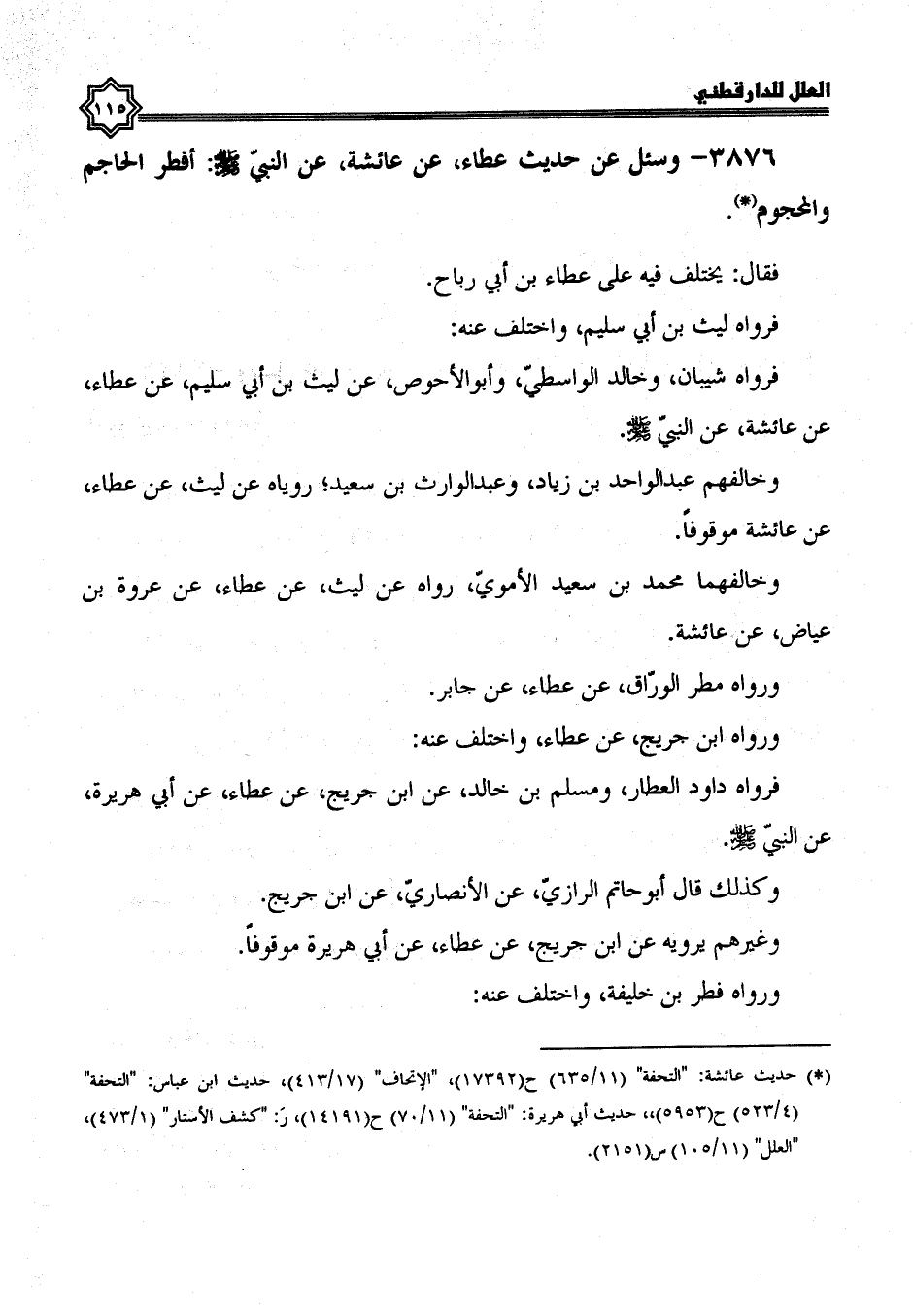3876- وسئل عن حديث عطاء، عَنْ عَائِشَةَ، عَنِ النَّبِيِّ صَلَّى اللَّهُ عَلَيْهِ وسلم، أفطر الحاجم والمحجوم فقال: يختلف فيه على عَطَاءِ بْنِ أَبِي رَبَاحٍ؛