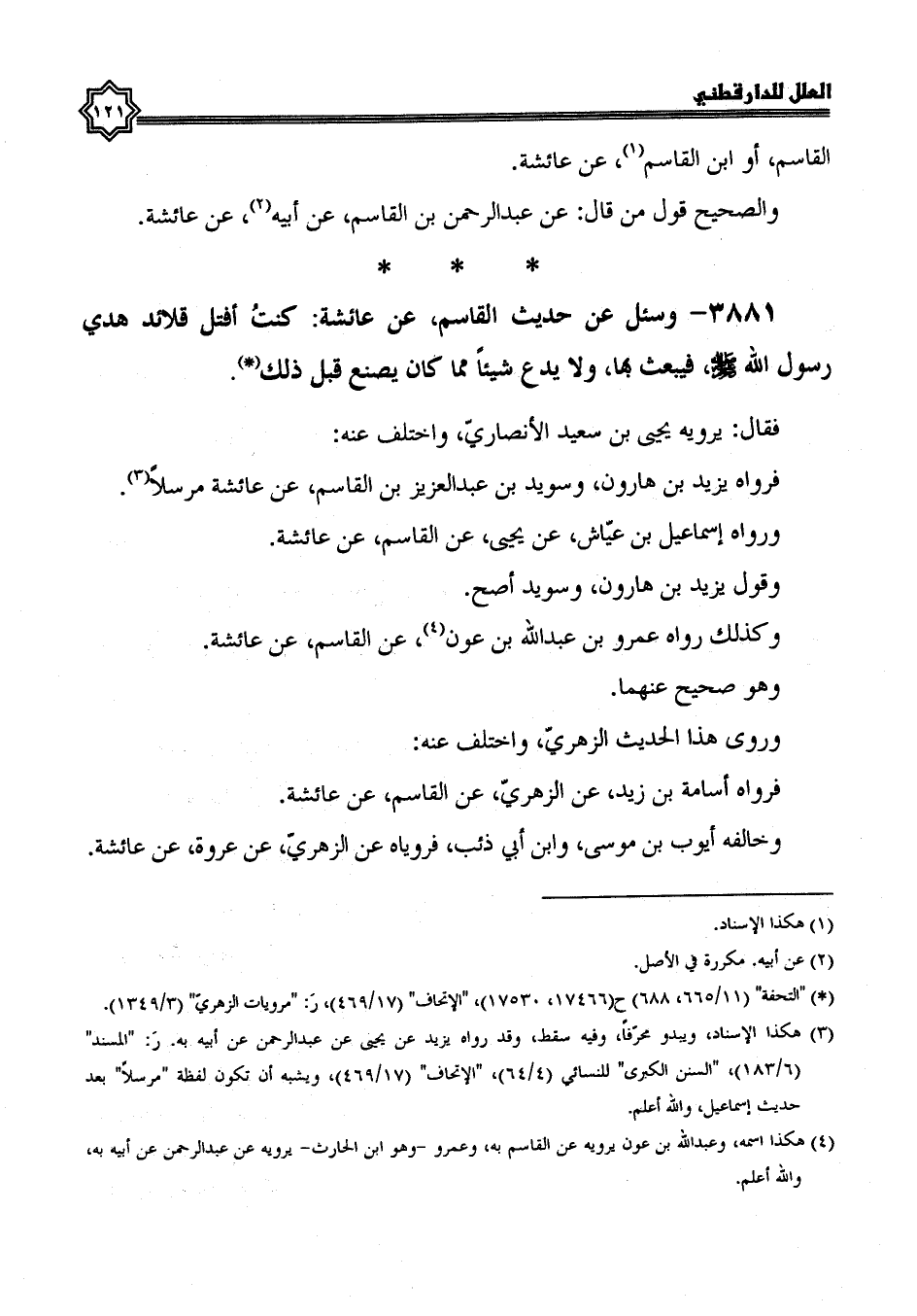 3881- وسئل عن حديث القاسم، عن عائشة: كنت أفتل قلائد هدي رسول الله صلى الله عليه وسلم، فيبعث بها، ولا يدع شيئا مما كان يصنع قبل ذلك.