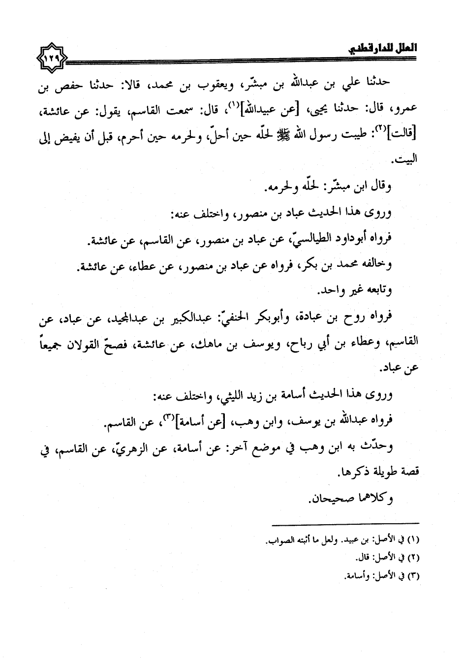 حَدَّثَنَا عَلِيُّ بْنُ عَبْدِ اللَّهِ بْنِ مُبَشِّرٍ، وَيَعْقُوبُ بْنُ مُحَمَّدٍ، قَالَا: حَدَّثَنَا حَفْصُ بْنُ عمرو، قال: حدثنا يحيى، عن عبيد الله، قال: سمعت القاسم، يقول: عن عائشة قالت: طيبت رسول الله صلى الله عليه وسلم لحله حين أحل، ولحرمه حين أحرم قبل أن يفيض إلى البيت، وقال ابن مبشر: لحله ولحرمه وروى هذا الحديث عباد بن منصور، وَاخْتُلِفَ عَنْهُ؛