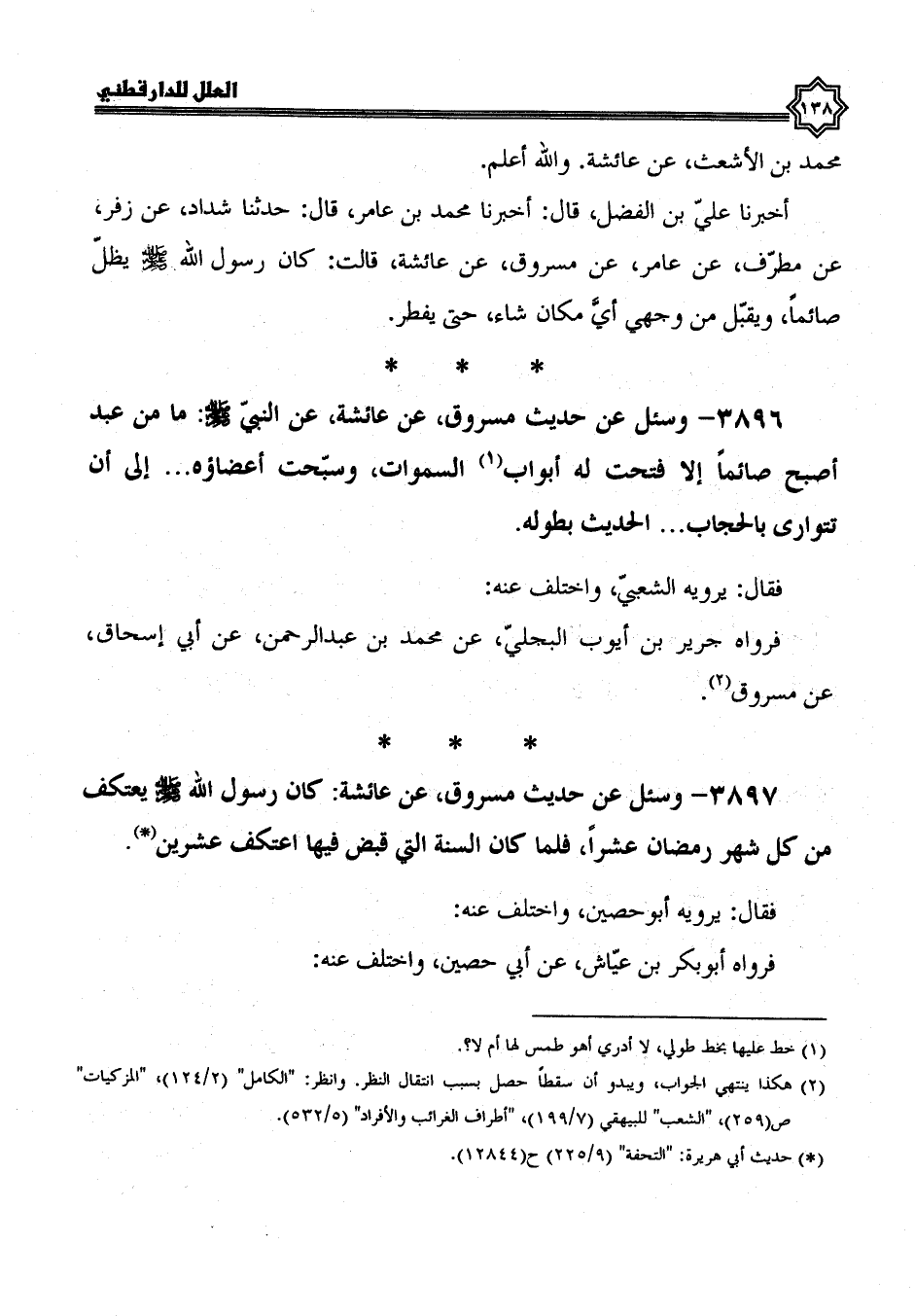 3897- وسئل عن حديث مسروق، عن عائشة، كَانَ رَسُولُ اللَّهِ صَلَّى اللَّهُ عَلَيْهِ وَسَلَّمَ يعتكف من كل شهر رمضان عشرا، فلما كان السنة التي قبض فيها اعتكف عشرين.