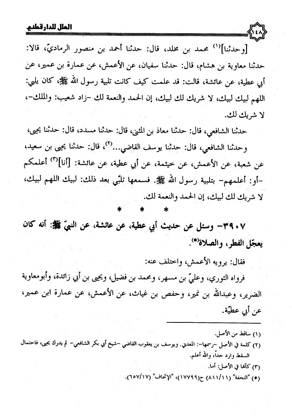 3907- وسئل عن حديث أبي عطية، عَنْ عَائِشَةَ، عَنِ النَّبِيِّ صَلَّى اللَّهُ عَلَيْهِ وسلم، أنه كان يعجل الفطر والصلاة.
