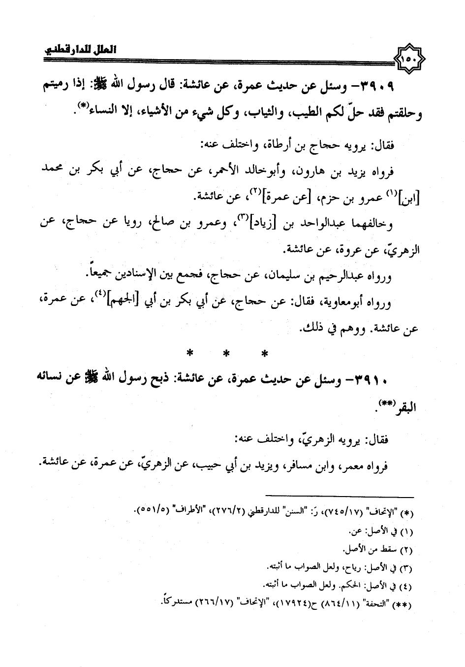 3909- وسئل عن حديث عمرة، عن عائشة، قال رسول الله صلى الله عليه وسلم: إذا رميتم وحلقتم فقد حل لكم الطيب والثياب، وكل شيء من الأشياء إلا النساء.