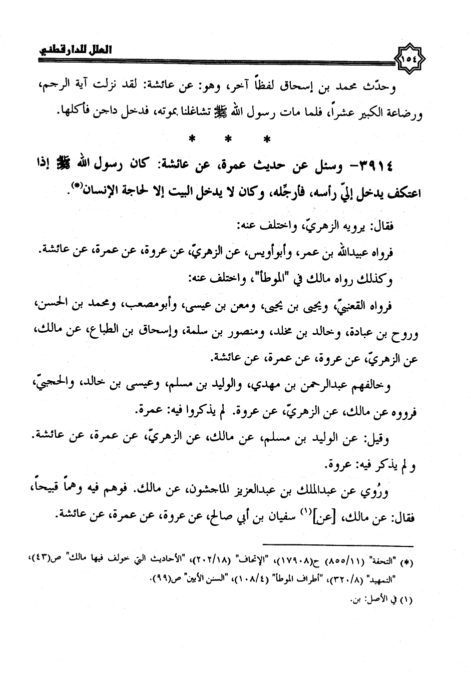 فرواه القعنبي، ويحيى بن يحيى، ومعن بن عيسى، وأبو مصعب، ومحمد بن الحسن، وروح بن عبادة، وخالد بن مخلد، ومنصور بن سلمة، وإسحاق بن الطباع، عَنْ مَالِكٍ، عَنِ الزُّهْرِيِّ، عَنْ عُرْوَةَ، عَنِ عمرة، عن عائشة وخالفهم عبد الرحمن بن مهدي، والوليد بن مسلم، وعيسى بن خالد، والحجبي، فرووه عن مالك، عن الزهري، عن عروة، لم يذكروا فيه عمرة.