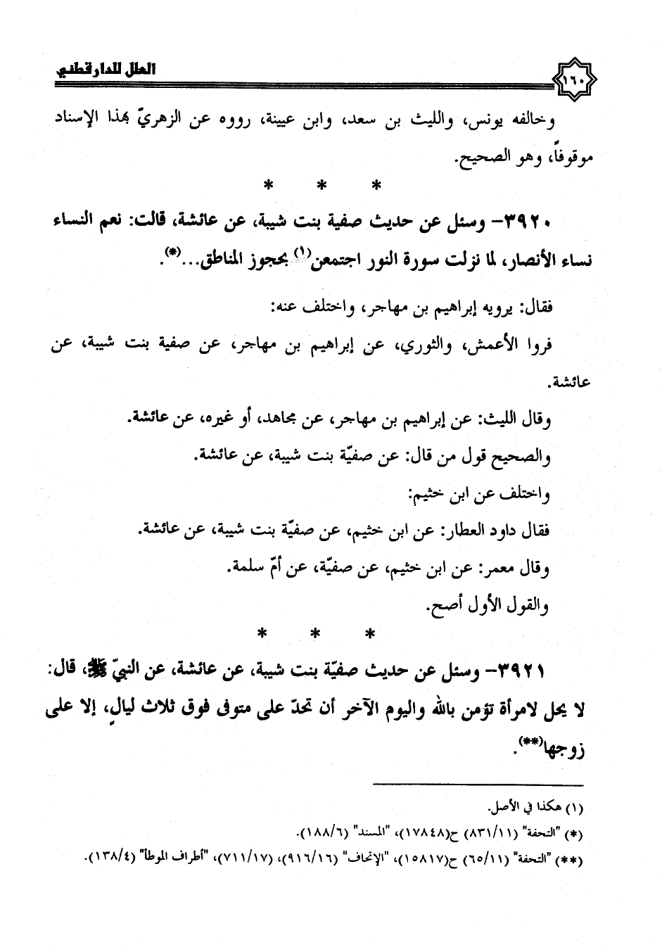 3921- وسئل عن حديث صفية بنت شيبة، عَنْ عَائِشَةَ، عَنِ النَّبِيِّ صَلَّى اللَّهُ عَلَيْهِ وسلم، قال: لا يحل لامرأة تؤمن بالله واليوم الآخر أن تحد على متوفى فوق ثلاث ليال إلا على زوجها.