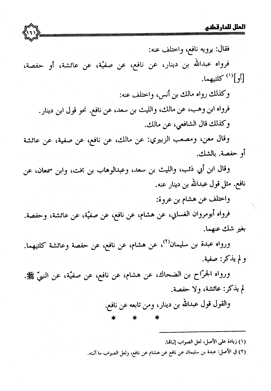 ورواه الجراح بن الضحاك، عن هشام، عن نافع، عن صفية، عَنِ النَّبِيِّ صَلَّى اللَّهُ عَلَيْهِ وَسَلَّمَ، لَمْ يذكر عائشة، ولا حفصة والقول قول عبد الله بن دينار، ومن تابعه، عن نافع.