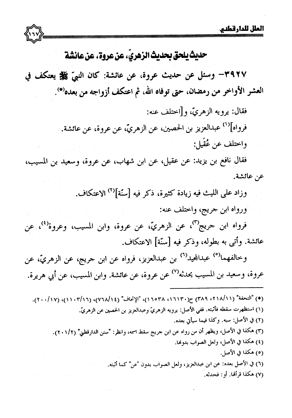 3927- وسئل عن حديث عروة، عن عائشة، كان النبي صلى الله عليه وسلم يعتكف في العشر الأواخر من رمضان حتى توفاه الله، ثم اعتكف أزواجه من بعده.