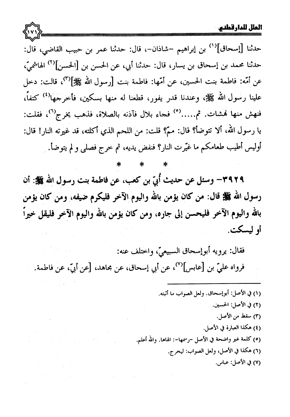 3929- وسئل عن حديث أبي بن كعب، عَنْ فَاطِمَةَ بِنْتِ رَسُولِ اللَّهِ صَلَّى اللَّهُ عليه وسلم، إن رسول الله صلى الله عليه وسلم، قال: مَنْ كَانَ يُؤْمِنُ بِاللَّهِ وَالْيَوْمِ الْآخِرِ فَلْيُكْرِمْ ضَيْفَهُ، ومن كان يؤمن بالله واليوم الآخر فليحسن إلى جَارَهُ، وَمَنْ كَانَ يُؤْمِنُ بِاللَّهِ وَالْيَوْمِ الْآخِرِ فَلْيَقُلْ خَيْرًا أو ليسكت.
