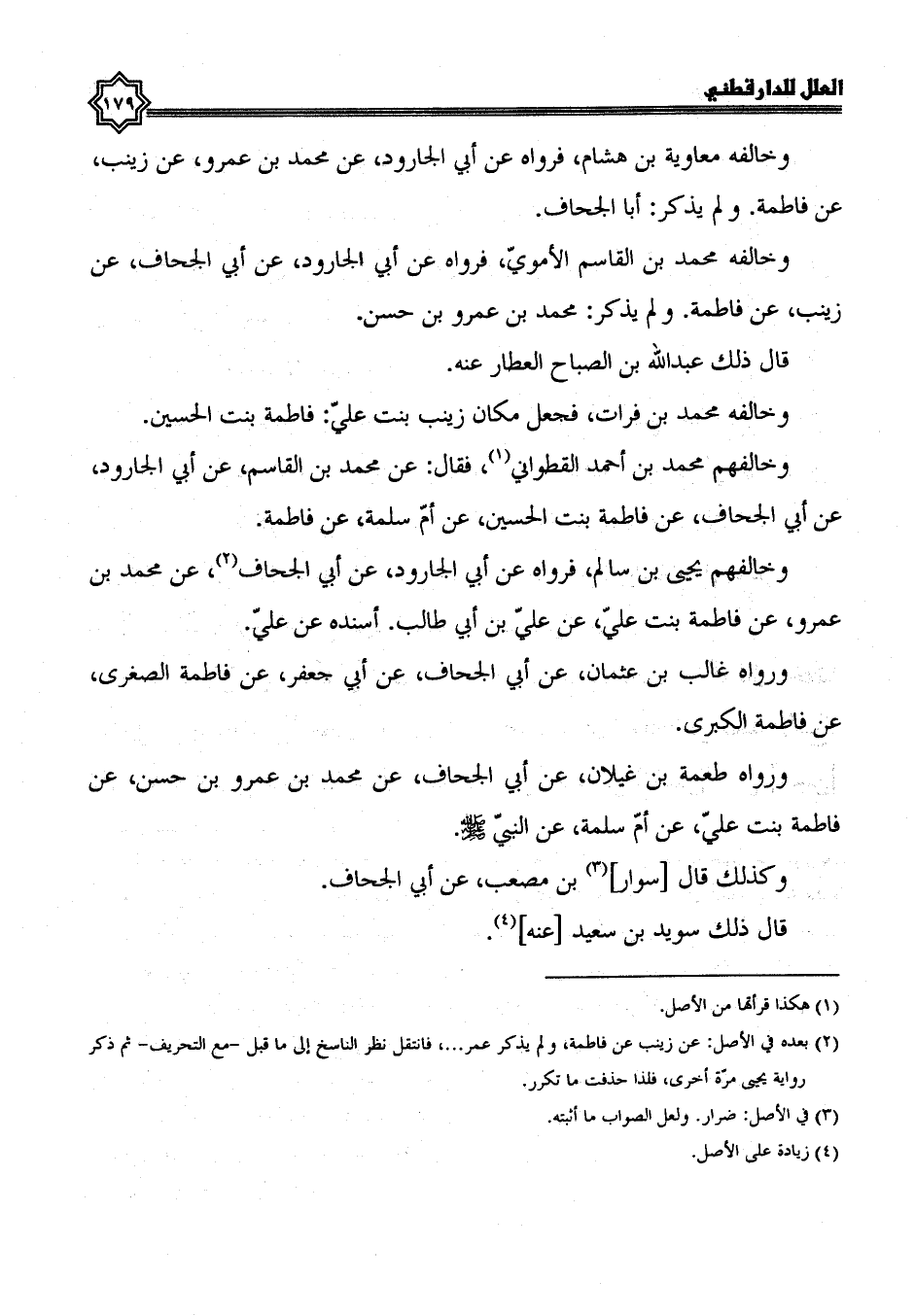 فرواه عن أبي الجارود، عن أبي الجحاف، عن زينب، عن فاطمة، ولم يذكر محمد بن عمرو بن حسن، قَالَ ذَلِكَ عَبْدُ اللَّهِ بْنُ الصَّبَّاحُ الْعَطَّارُ، عنه.