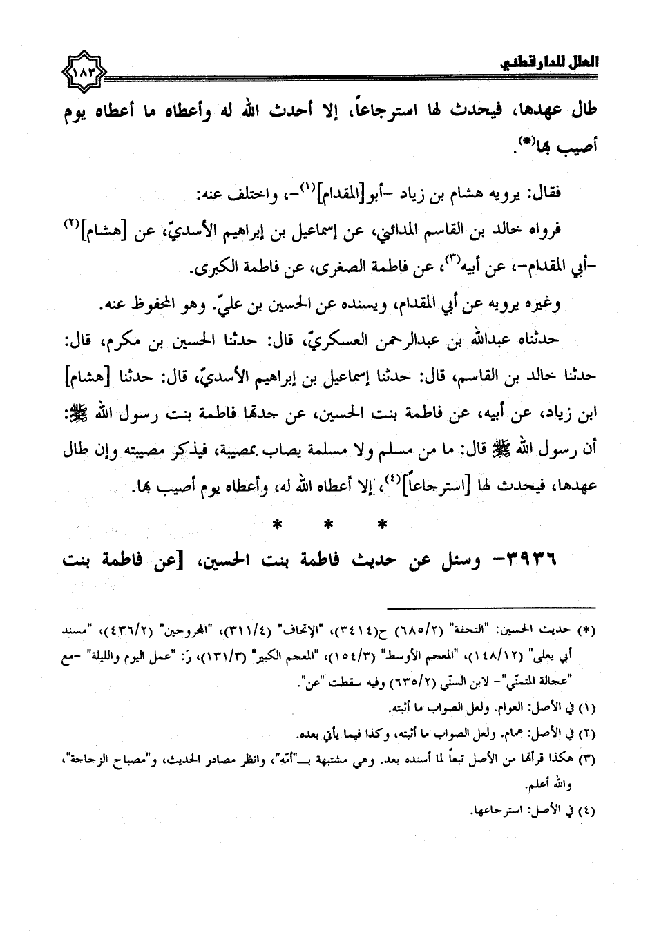 3935- وسئل عن حديث فاطمة بنت الحسين، عن فاطمة، قال رسول الله صلى الله عليه وسلم: ما من مسلم ولا مسلمة يصاب بمصيبة فيذكر مصيبته وإن طال عهدها فيحدث لها استرجاعا إلا أحدث الله له وأعطاه ما أعطاه يوم أصيب بها.