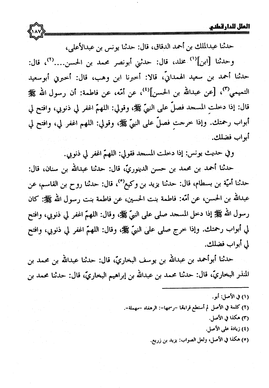 حدثنا عبد الملك بن أحمد الدقاق، قال: حدثنا يونس بن عبد الأعلى، وحدثنا ابن مخلد، قال: حدثني أبو نصر محمد بن الحسن ... ، قال: حدثنا أحمد بن سعيد الهمداني، قالا: أخبرنا ابن وهب، قال: أخبرني أبو سعيد التميمي، عن عبد الله بن الحسن، عن أمه، عن فاطمة، أن رسول الله صلى الله عليه وسلم، قال: إذا دخلت المسجد فصل على النبي، صلى الله عليه وسلم، وقولي: اللهم اغفر لي ذنوبي، وافتح لي أبواب رحمتك، وإذا خرجت فصل على النبي، صلى الله عليه وسلم، وقولي: اللهم اغفر لي، وافتح لي أبواب فضلك وفي حديث يونس إذا دخلت المسجد فقولي: اللهم اغفر لي ذنوبي.