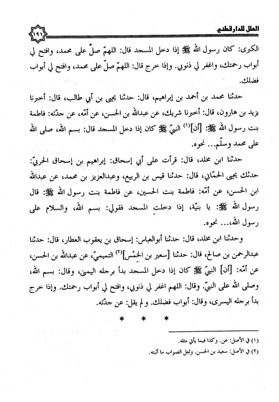 وحدثنا ابن مخلد، قال: حدثنا أبو العباس إسحاق بن يعقوب العطار، قال: حدثنا عبد الرحمن بن صالح، قال: حدثنا سعير بن الخمس التميمي، عن عبد الله بن الحسن، عن أمه، أن النبي صلى الله عليه وسلم، كان إذا دخل المسجد بدأ برجله اليمنى، وقال: بسم الله، وصلى الله على النبي، وقال: اللهم اغفر لي ذنوبي، وافتح لي أبواب رحمتك، وإذا خرج بدأ برجله اليسرى، وقال: أبواب فضلك ولم يقل عن جدته.