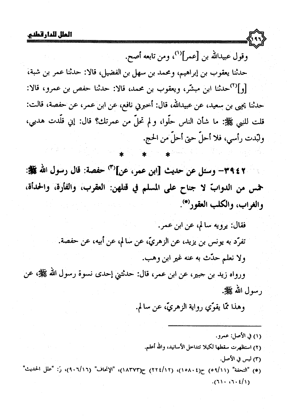 3942- وسئل عن حديث ابن عمر، عن حفصة، قال رسول الله صلى الله عليه وسلم: خمس من الدواب لا جناح على المسلم في قتلهن: العقرب، والفأرة، والحدأة، والغراب، والكلب العقور.