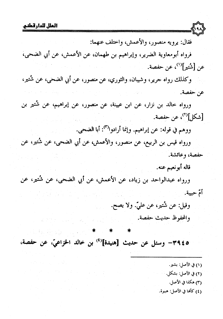 ورواه خالد بن نزار، عن ابْنُ عُيَيْنَةَ، عَنْ مَنْصُورٍ، عَنْ إِبْرَاهِيمَ، عَنْ شتير بن شكل، عن حفصة، ووهم في قوله عن إبراهيم، وإنما أرادوا أبا الضحى.
