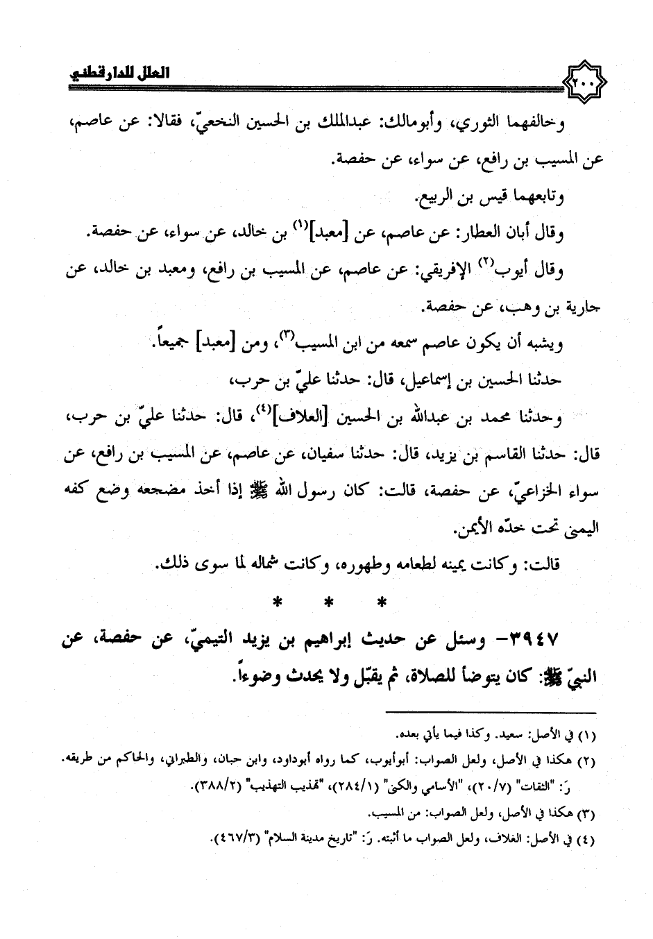 وتابعهما قيس بن الربيع، وقال أبان العطار: عن عاصم، عن معبد بن خالد، عن سواء، عن حفصة، وقال أيوب الإفريقي: عن عاصم، عن المسيب بن رافع، ومعبد بن خالد، عن جارية بن وهب، عن حفصة، ويشبه أن يكون عاصم سمعه من ابن المسيب، ومن معبد جميعا.