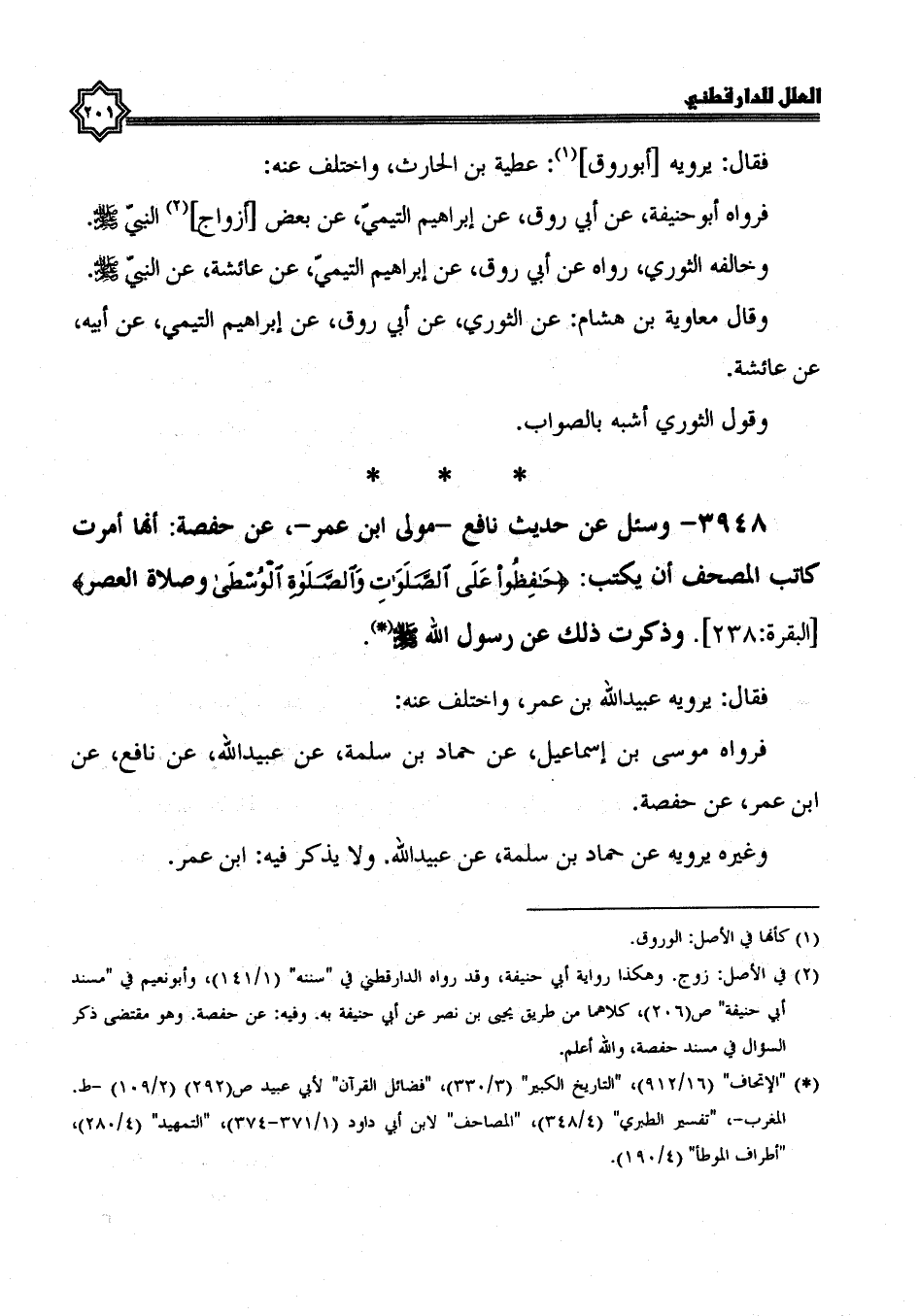 3948- وَسُئِلَ عَنْ حَدِيثِ نَافِعٍ، مَوْلَى ابْنِ عُمَرَ، عن حفصة: أنها أمرت كاتب المصحف أن يكتب: {حافظوا على الصلوات والصلاة الوسطى وصلاة العصر} ، وذكرت ذلك عَنْ رَسُولِ اللَّهِ صَلَّى اللَّهُ عَلَيْهِ وَسَلَّمَ.