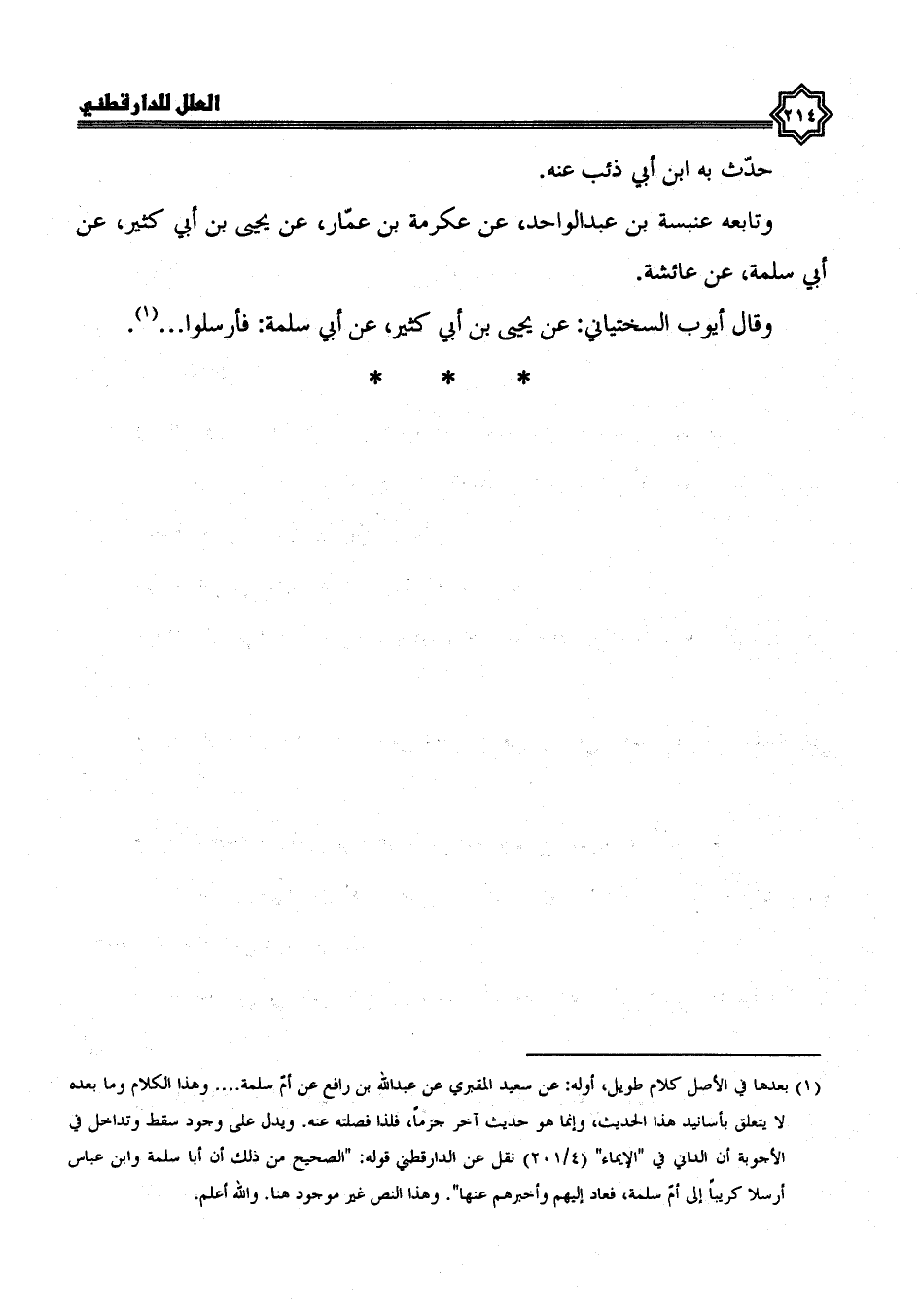 (1) هنا سقط في النسخة الخطية، وكتب محققه: نقل الداني، في "الإيماء" 4/201، عن الدارقطني تتمة ذلك، قوله: "والصحيح من ذلك أن أبا سلمة وابن عباس أرسلا كريبا إلى أم سلمة، فعاد إليهم وأخبرهم عنها".