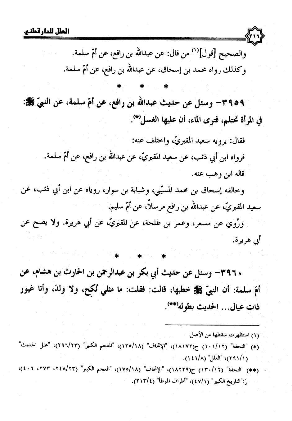 3959- وسئل عن حديث عَبْدِ اللَّهِ بْنِ رَافِعٍ، عَنْ أُمِّ سَلَمَةَ، عَنِ النَّبِيِّ صَلَّى اللَّهُ عَلَيْهِ وَسَلَّمَ، فِي المرأة تحتلم فترى الماء أن عليها الغسل.