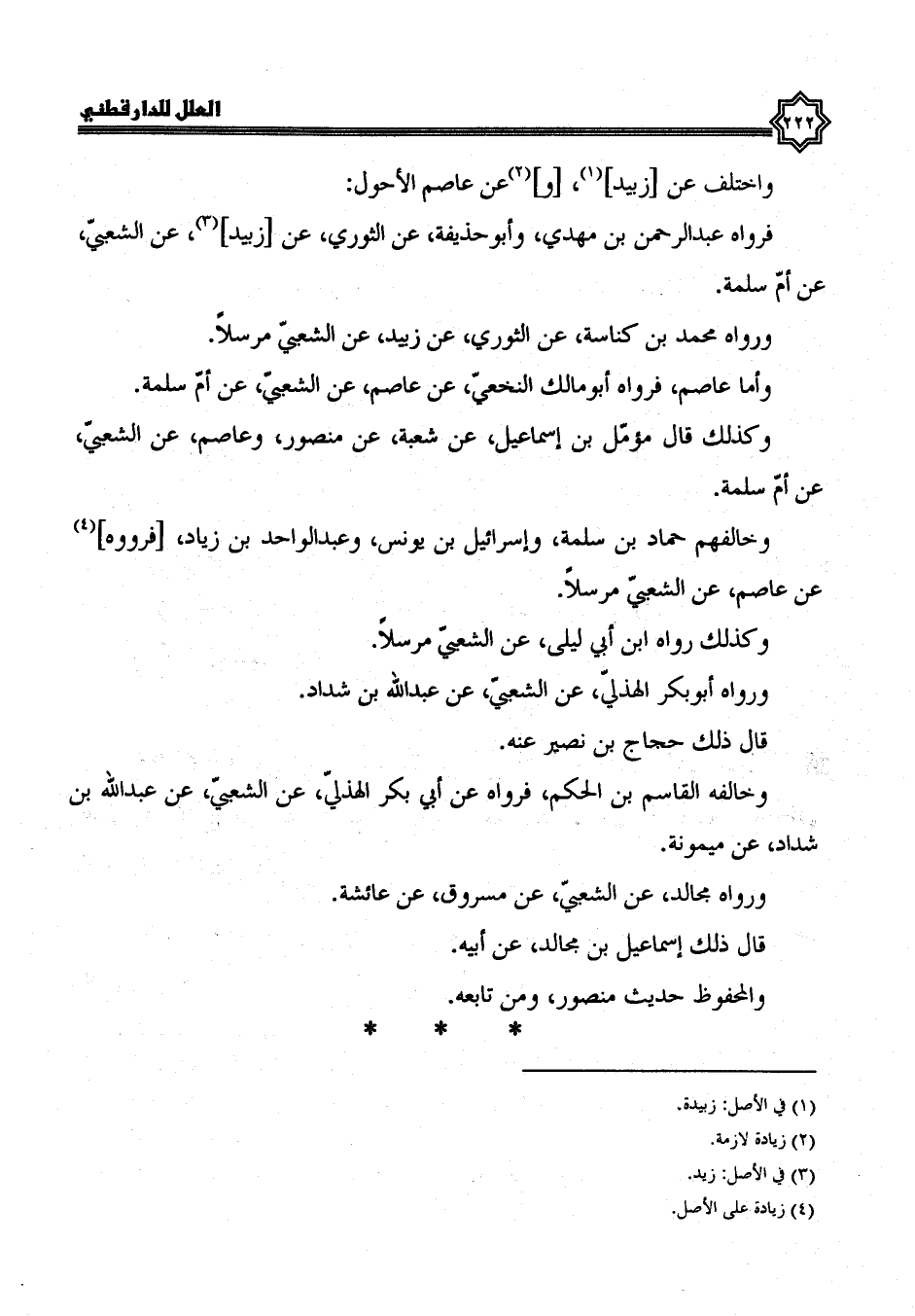 ورواه محمد بن كناسة، عن الثوري، عن زبيد، عن الشعبي، مرسلا وأما عاصم فرواه أبو مالك النخعي، عن عاصم، عن الشعبي، عن أم سلمة وكذلك قال مؤمل بن إسماعيل: عن شعبة، عن منصور، وعاصم، عن الشعبي، عن أم سلمة وخالفهم حماد بن سلمة، وإسرائيل بن يونس، وعبد الواحد بن زياد، فرووه عن عاصم، عن الشعبي، مرسلا، وكذلك رواه ابن أبي ليلى، عن الشعبي، مرسلا.