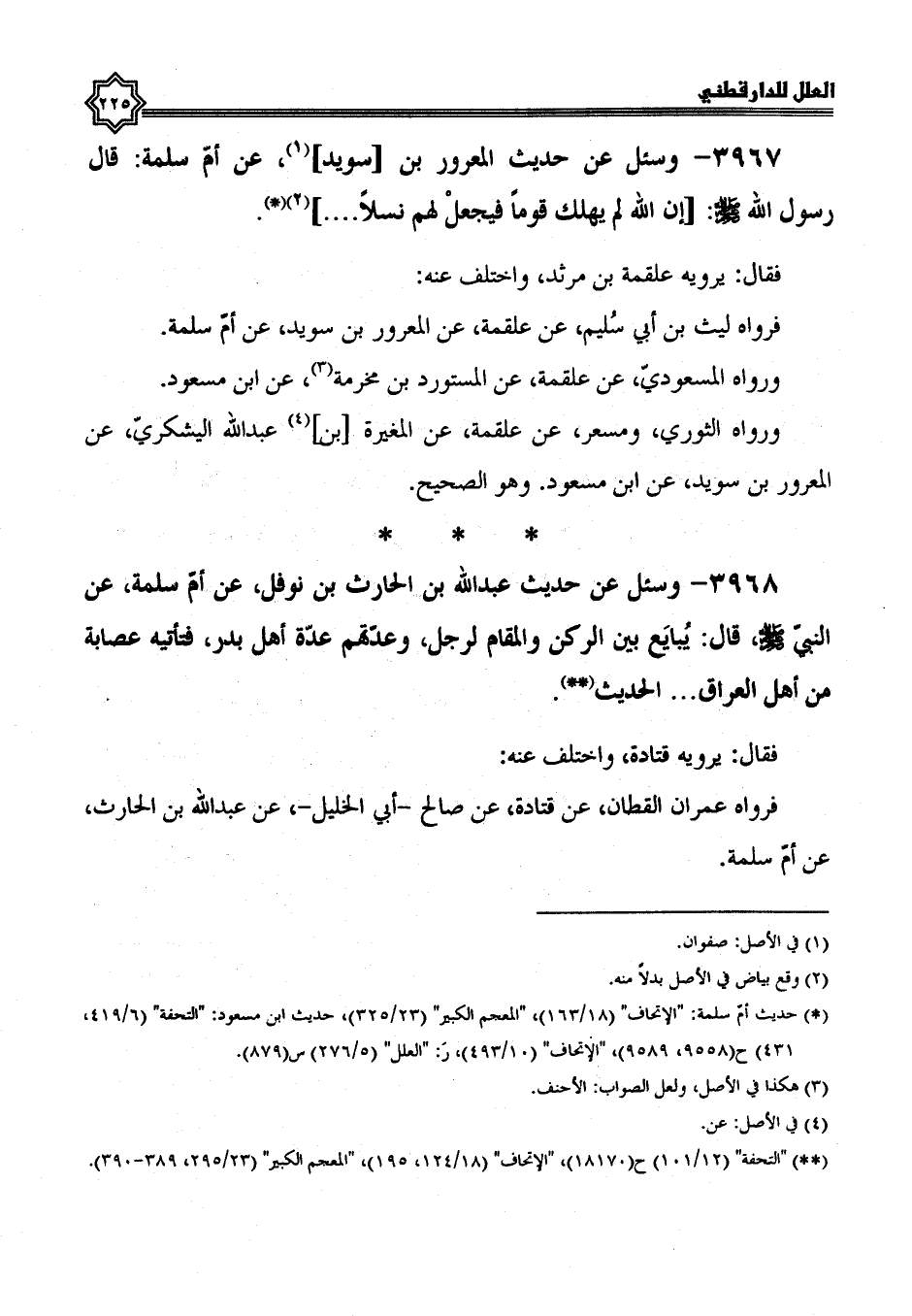 3968- وَسُئِلَ عَنْ حَدِيثِ عَبْدِ اللَّهِ بْنِ الْحَارِثِ بن نوفل، عن أم سَلَمَةَ، عَنِ النَّبِيِّ صَلَّى اللَّهُ عَلَيْهِ وَسَلَّمَ، قال: يبايع بين الركن والمقام لرجل وعدتهم عدة أهل بدر، فتأتيه عصابة من أهل العراق ... الْحَدِيثَ.