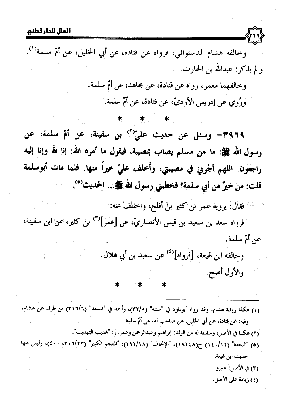 3969- وسئل عن حديث علي بن سفينة، عن أم سلمة، عَنْ رَسُولِ اللَّهِ صَلَّى اللَّهُ عَلَيْهِ وَسَلَّمَ: ما من مسلم يصاب بمصيبة فيقول ما أمره الله: إنا لله وإنا إليه راجعون، اللهم أجرني في مصيبتي واخلف علي خيرا منها فلما مات أبو سلمة قلت: من خير من أبي سلمة؟ فخطبني رسول الله صلى الله عليه وسلم ... الحديث.