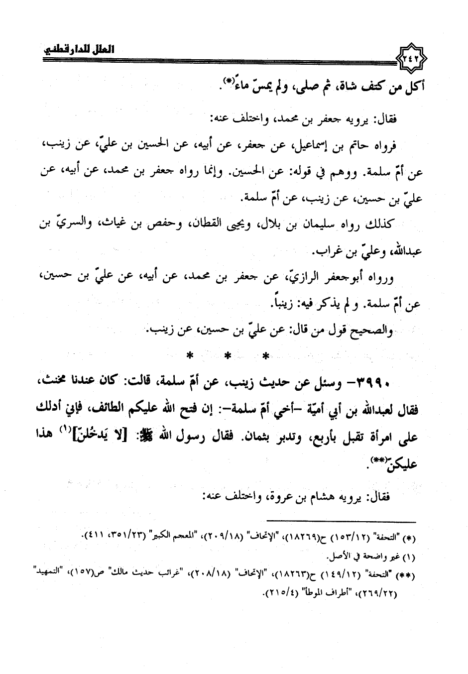 فَرَوَاهُ حَاتِمُ بْنُ إِسْمَاعِيلَ، عَنِ جعفر، عن أبيه، عن الحسين بن علي، عن زينب، عن أم سلمة ووهم في قوله عن الحسين، وإنما رواه جعفر بن محمد، عن أبيه، عن علي بن حسين، عن زينب، عن أم سلمة كذلك رواه سليمان بن بلال، ويحيى القطان، وحفص بن غياث، والسري بن عبد الله، وعلي بن غراب.