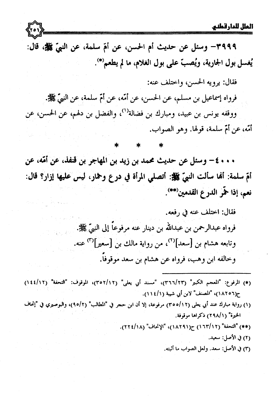 3999- وسئل عن حديث أم الحسن، عن أم سَلَمَةَ، عَنِ النَّبِيِّ صَلَّى اللَّهُ عَلَيْهِ وَسَلَّمَ، قَالَ: يُغْسَلُ بَوْلُ الْجَارِيَةِ، وَيُصَبُّ عَلَى بَوْلِ الغلام ما لم يطعم.
