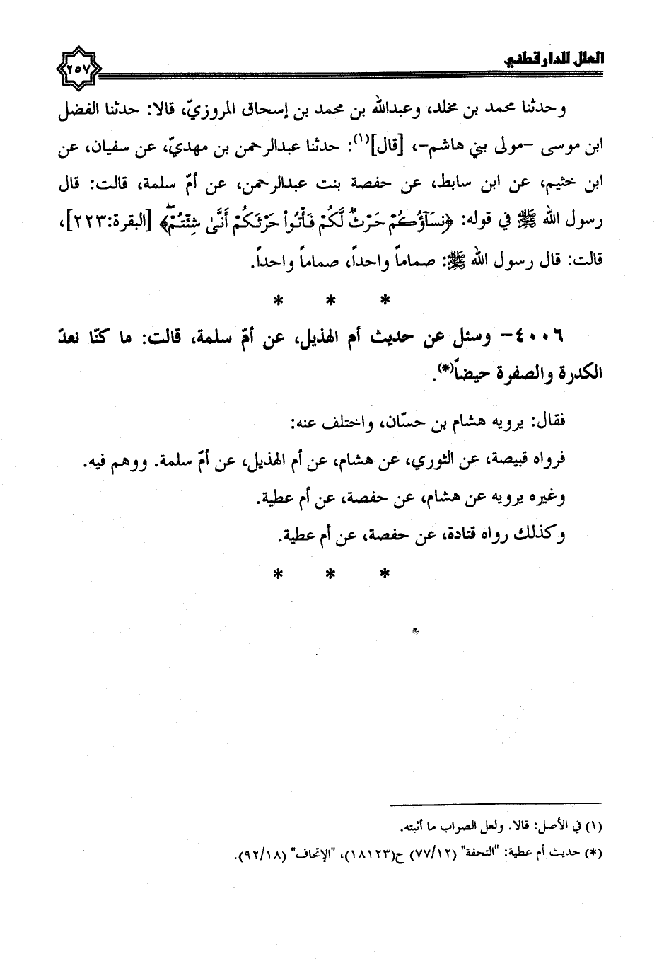 4006- وسئل عن حديث أم الهذيل، عن أم سلمة، قالت: ما كنا نعد الكدرة، والصفرة حيضا.