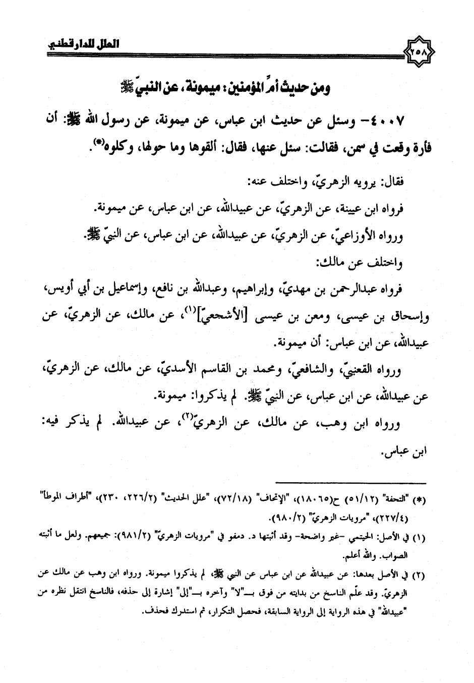 فرواه عبد الرحمن بن مهدي، وإبراهيم، وعبد الله بن نافع، وإسماعيل بن أبي أويس، وإسحاق بن عيسى، ومعن بن عيسى الأشجعي، عَنْ مَالِكٍ، عَنِ الزُّهْرِيِّ، عَنْ عُبَيْدِ اللَّهِ، عَنِ ابْنِ عباس، أن ميمونة.