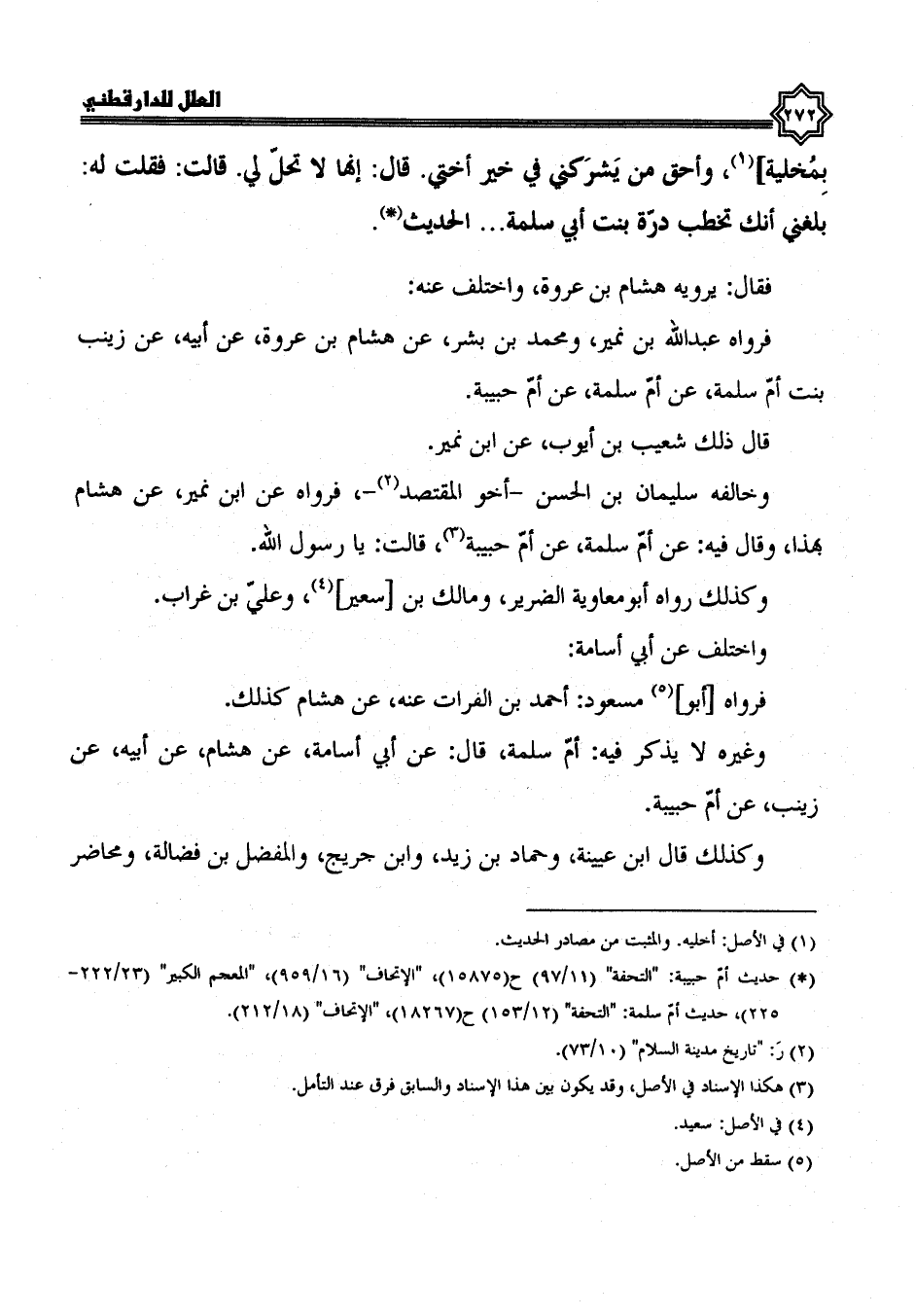 فرواه أبو مسعود أحمد بن الفرات، عنه، عن هشام، كذلك، وغيره لا يذكر فيه أم سلمة، قال: عَنْ أَبِي أُسَامَةَ، عَنْ هِشَامٍ، عَنْ أَبِيهِ، عن زينب، عن أم حبيبة.