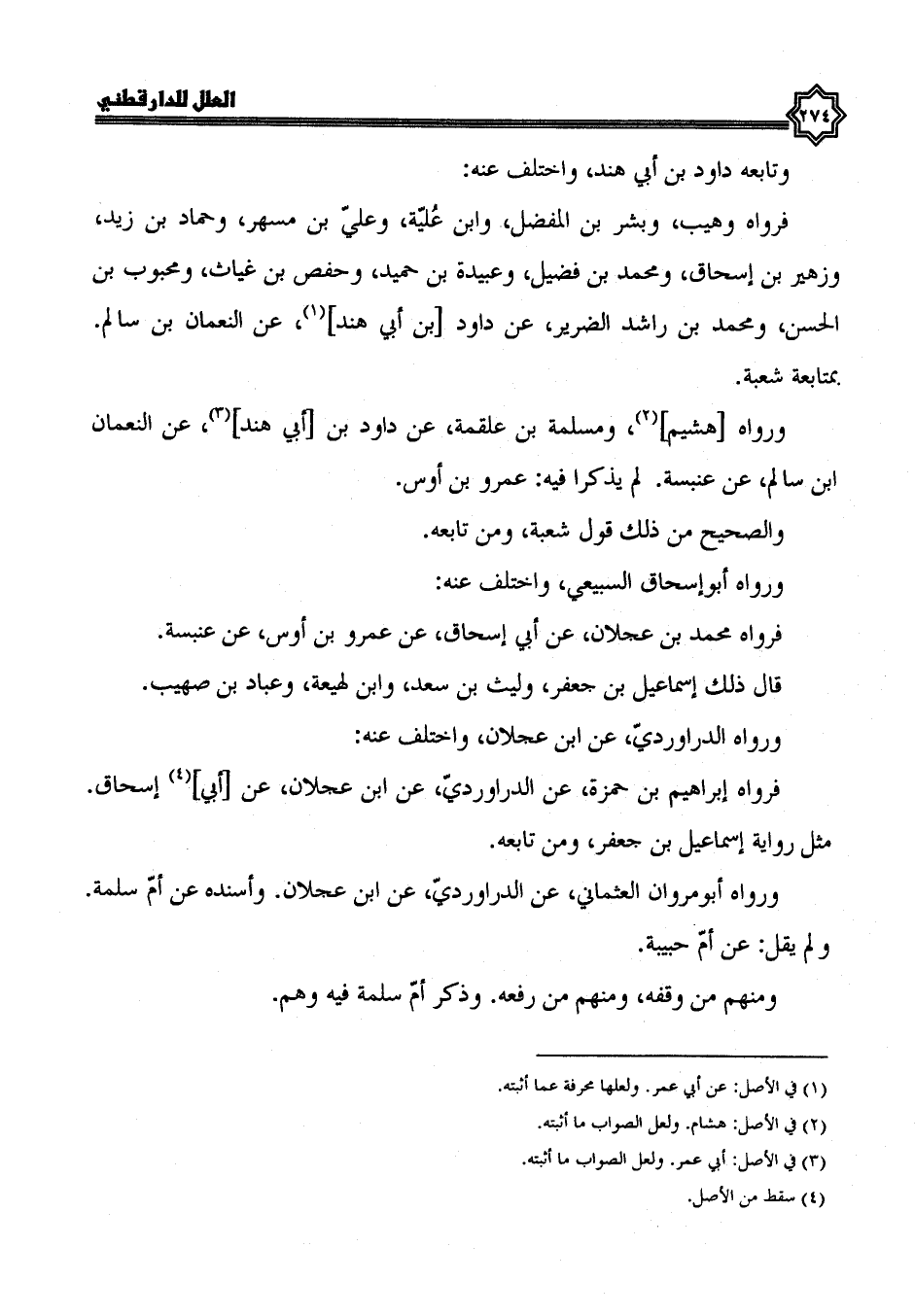 ورواه هشيم، ومسلمة بْنُ عَلْقَمَةَ، عَنْ دَاوُدَ بْنِ أَبِي هِنْدٍ، عن النعمان بن سالم، عن عنبسة لم يذكرا فيه عمرو بن أوس.