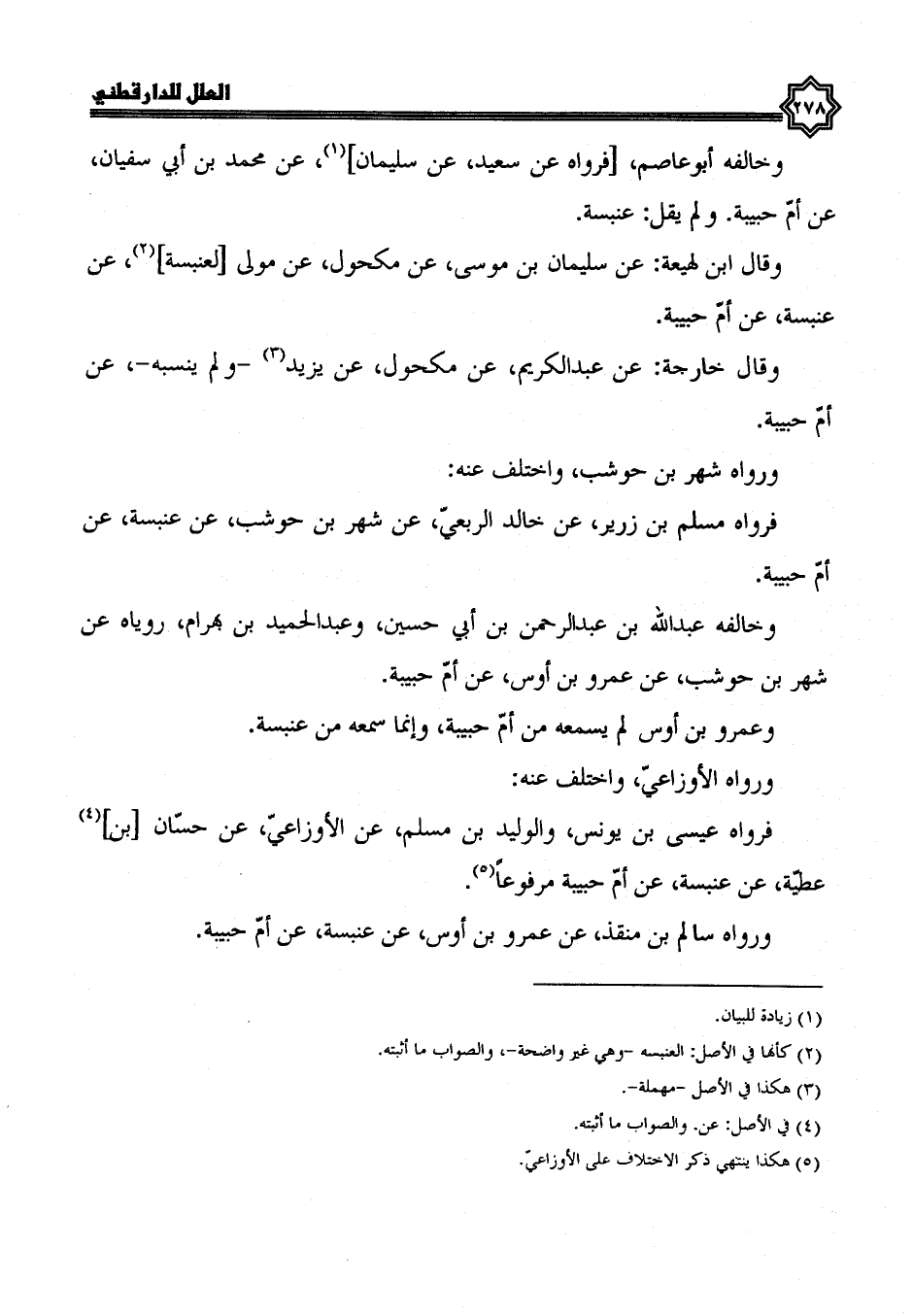 وخالفه عبد الله بن عبد الرحمن بن أبي حسين، وعبد الحميد بن بهرام، روياه عن شهر بن حوشب، عن عمرو بن أوس، عن أم حبيبة وعمرو بن أوس لم يسمعه من أم حبيبة، وإنما سمعه من عنبسة.
