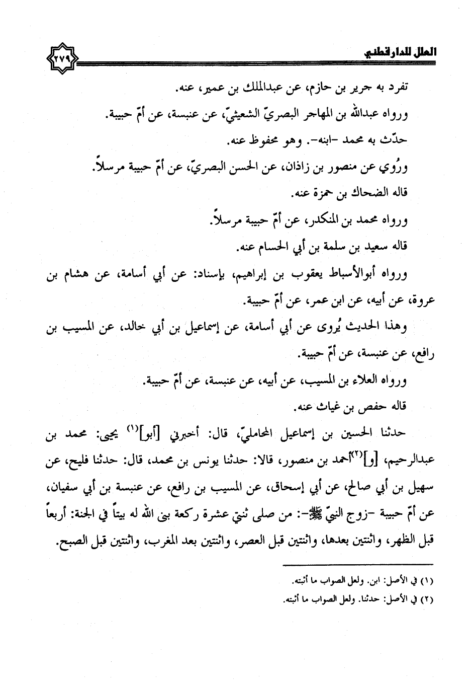 حدثنا الحسين بن إسماعيل المحاملي، قال: أخبرني أبو يحيى محمد بن عبد الرحيم، وأحمد بن منصور، قالا: حدثنا يونس بن محمد، قال: حدثنا فليح، عن سهيل بن أبي صالح، عن أبي إسحاق، عَنِ الْمُسَيَّبِ بْنِ رَافِعٍ، عَنْ عَنْبَسَةَ بْنِ أَبِي سُفْيَانَ، عَنْ أُمِّ حبيبة، زوج النَّبِيِّ صَلَّى اللَّهُ عَلَيْهِ وَسَلَّمَ، مَنْ صَلَّى ثنتي عشرة ركعة بنى الله له بيتا في الجنة، أربعا قبل الظهر، واثنتين بعدها، واثنتين قبل العصر واثنتين بعد المغرب، واثنتين قبل الصبح.