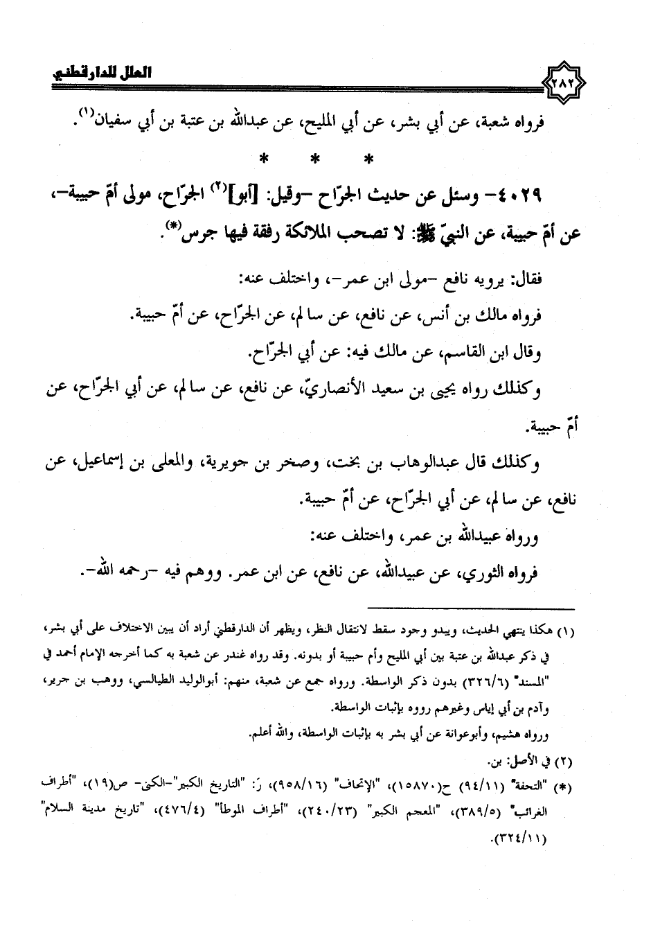 4029- وسئل عن حديث الجراح، وقيل أبو الجراح مولى أم حبيبة، عن أم حبيبة، عَنِ النَّبِيِّ صَلَّى اللَّهُ عَلَيْهِ وَسَلَّمَ، لَا تصحب الملائكة رفقة فيها جرس.