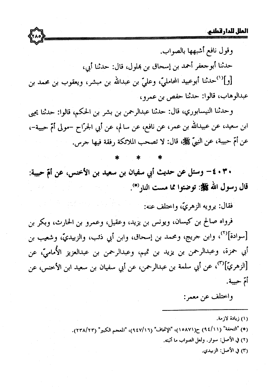 4030- وسئل عن حديث أَبِي سُفْيَانَ بْنِ سَعِيدِ بْنِ الْأَخْنَسِ، عَنْ أم حبيبة، قال رسول الله صلى الله عليه وسلم: توضؤوا مما مست النار.