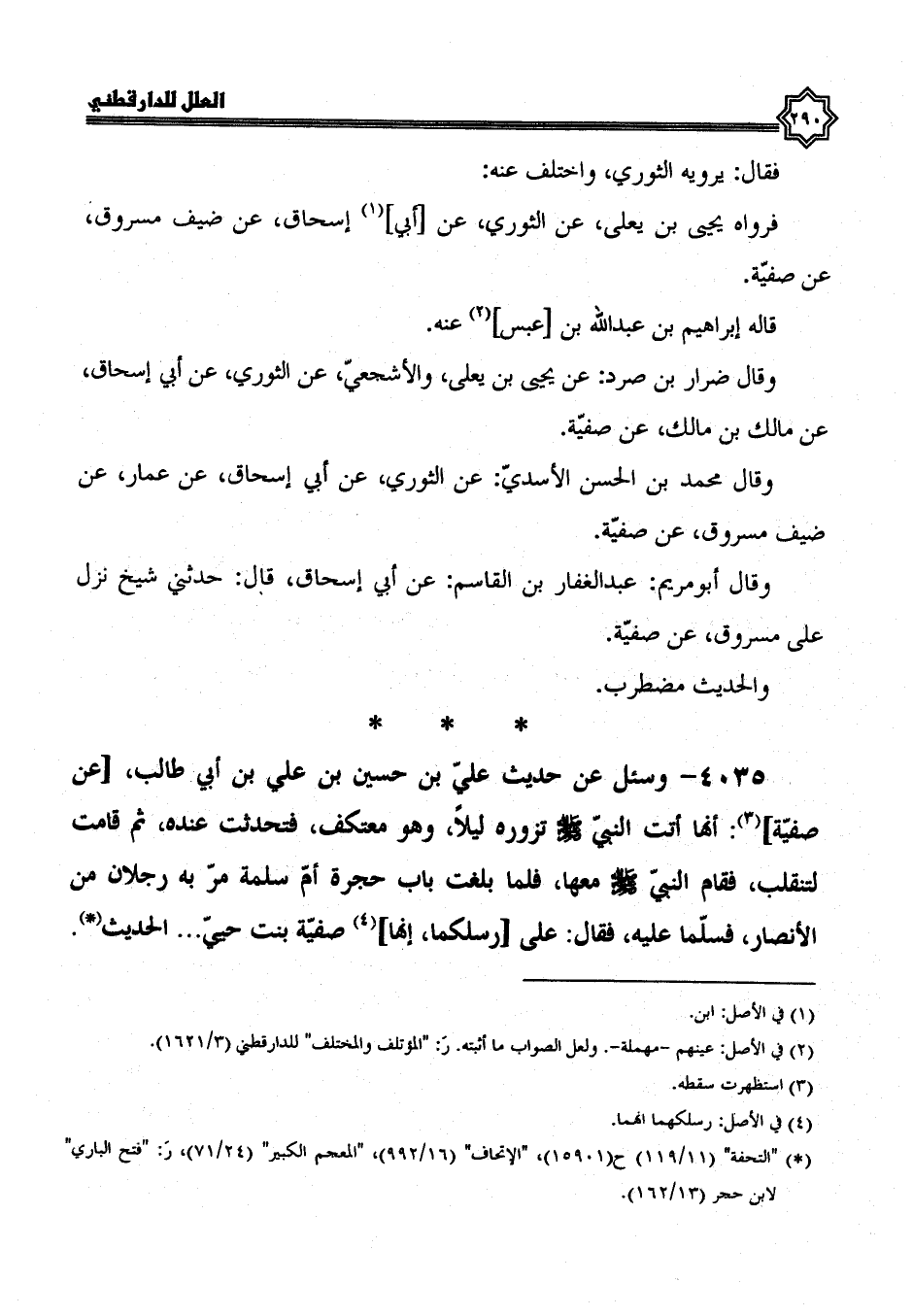 4035- وسئل عن حديث علي بن حسين بن علي بن أبي طالب، عن صفية أنها أتت النبي صلى الله عليه وسلم تزوره ليلا وهو معتكف فتحدثت عنده، ثم قامت لتنقلب فقام النبي صلى الله عليه وسلم معها، فلما بلغت باب حجرة أم سلمة مر به رجلان من الأنصار فسلما عليه، فقال: على رسلكما إنها صفية بنت حيي ... الحديث.