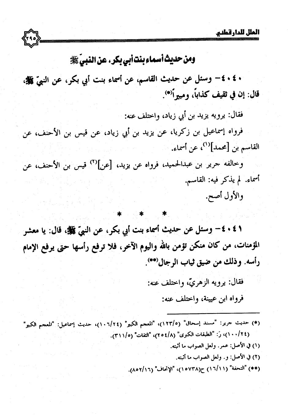 4041- وسئل عن حديث أسماء بنت أَبِي بَكْرٍ، عَنِ النَّبِيِّ صَلَّى اللَّهُ عَلَيْهِ وسلم: قال: يا معشر المؤمنات من كان منكن تؤمن بالله واليوم الآخر فلا ترفع رأسها حتى يرفع الإمام رأسه، وذلك من ضيق ثياب الرجال.