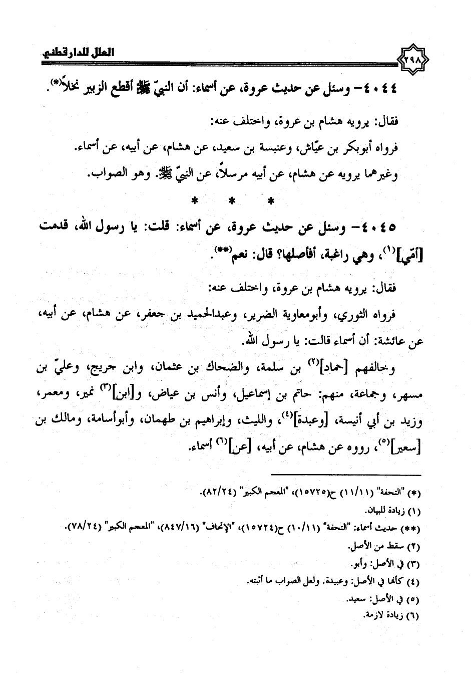 فرواه الثوري، وأبو معاوية الضرير، وعبد الحميد بن جعفر، عن هشام، عن أبيه، عن عائشة، أن أسماء، قالت: يا رسول الله، وخالفهم حماد بن سلمة، والضحاك بن عثمان، وابن جريج، وعلي بن مسهر، وجماعة منهم حاتم بن إسماعيل، وأنس بن عياض، وابن نمير، ومعمر، وزيد بن أبي أنيسة، وعبدة، والليث، وإبراهيم بن طهمان، وأبو أسامة، ومالك بن سعير، رووه عن هشام، عن أبيه، عن أسماء،