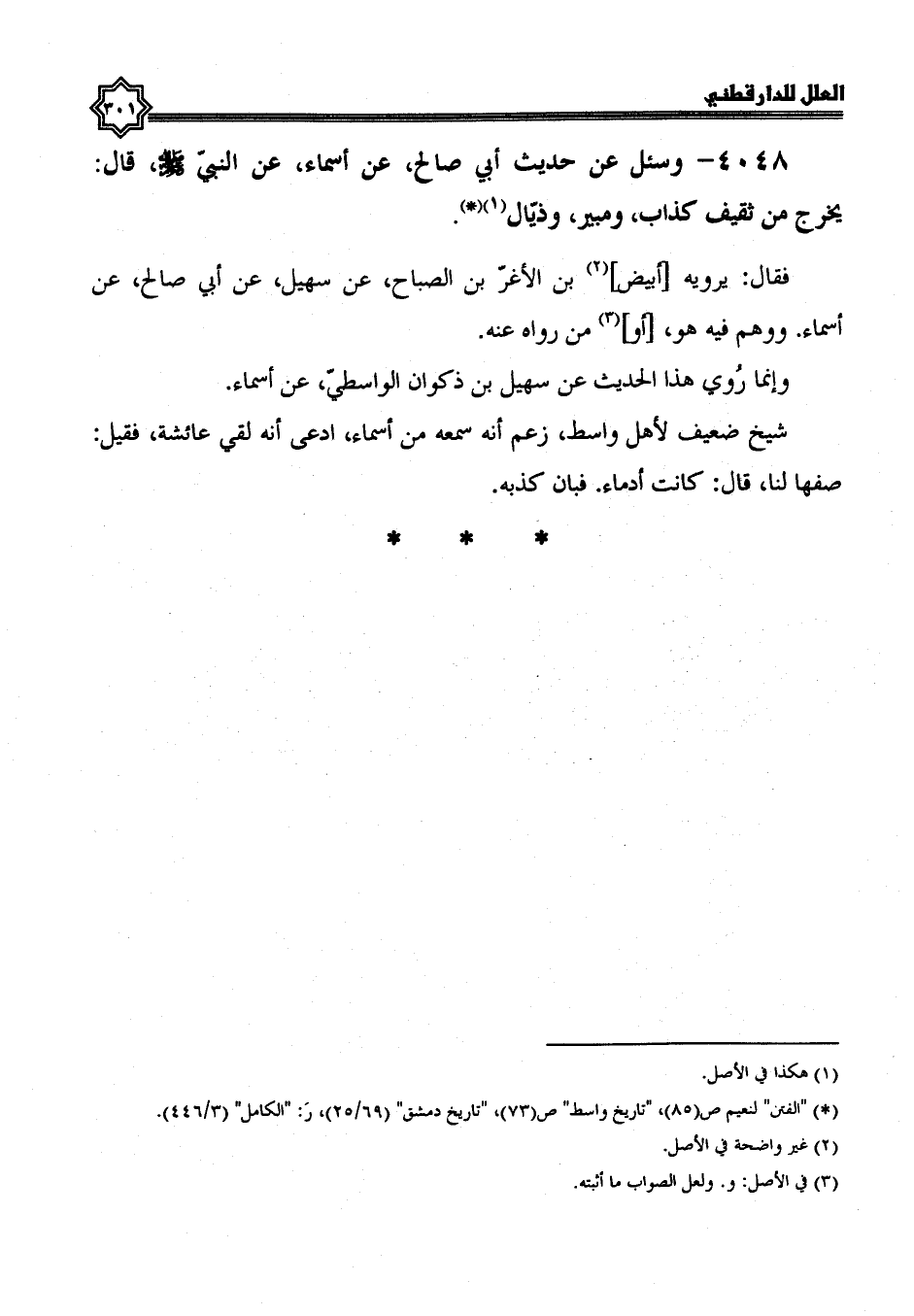 فقال: يرويه أبيض بن الأغر بن الصباح، عن سهيل، عن أبي صالح، عن أسماء، ووهم فيه هو، أو من رواه عنه، وإنما روي هذا الحديث عن سهيل بن ذكوان الواسطي، عن أسماء، شيخ ضعيف لأهل واسط زعم أنه سمعه من أسماء، ادعى أنه لقي عائشة فقيل: صفها لنا، قال: كانت أدماء فبان كذبه.