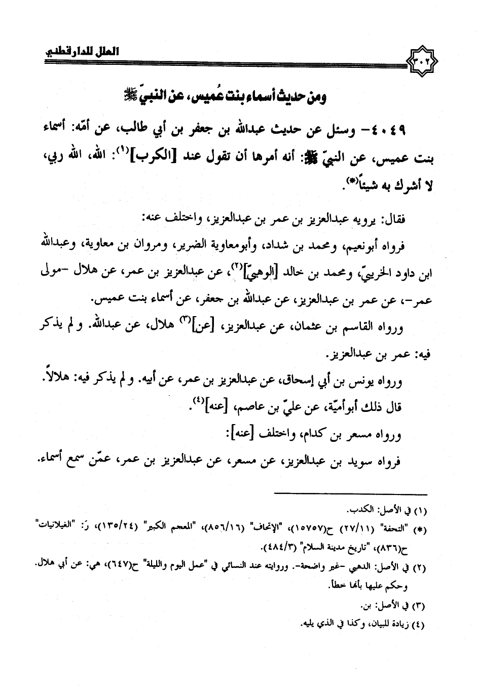 4049- وَسُئِلَ عَنْ حَدِيثِ عَبْدِ اللَّهِ بْنِ جَعْفَرِ بْنِ أبي طالب، عن أمه أسماء بنت عميس، عن النبي صلى الله عليه وسلم، إنه أمرها أن تقول عند الكرب: الله الله ربي لا أشرك به شيئا.